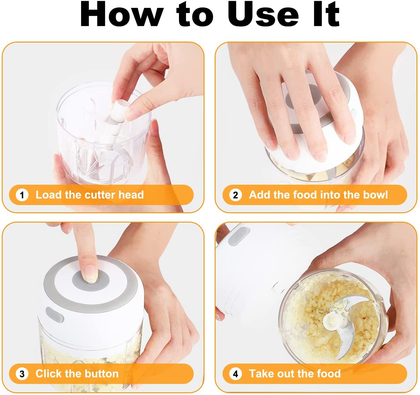 One-Touch Operation: Just put food or ingredients in the mini food processor by hand, lock the cover and start with one click to quickly shred food.