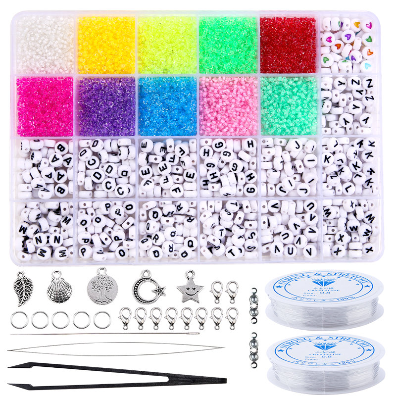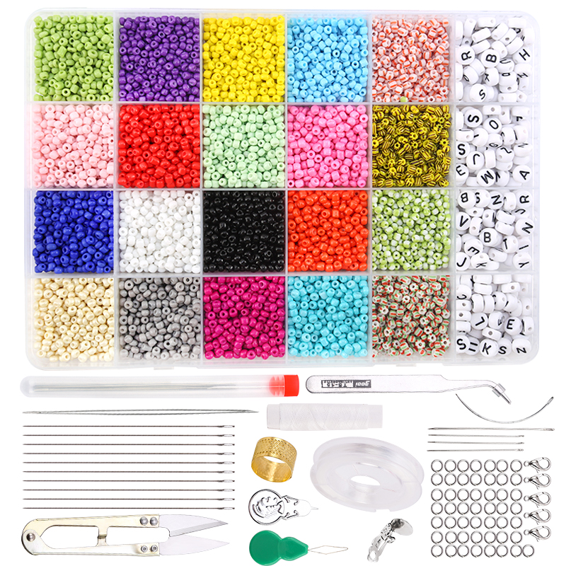 Glass beads set include 20000 pcs 2mm various colors seed beads with storage box, 2 rolls clear elastic thread, 100 pcs jump rings, 20 pcs claw clasps, 1 pcs scissors,2 pcs needles,1 pcs tweezer.