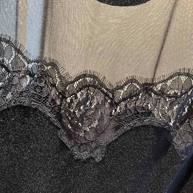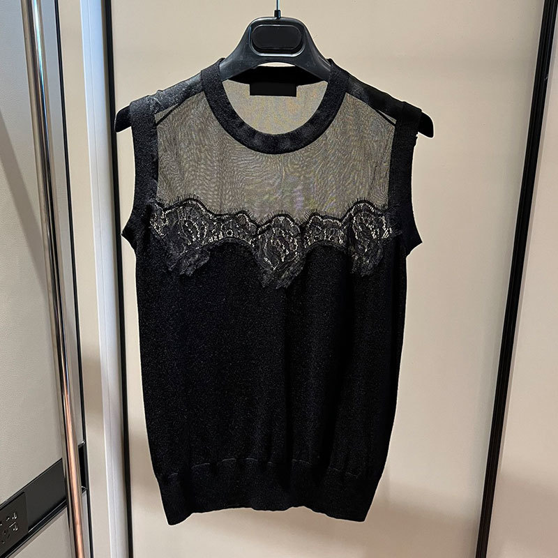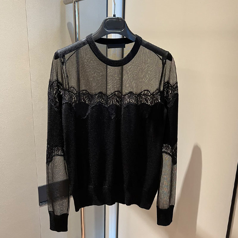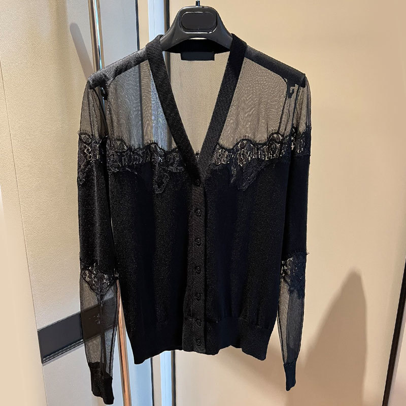 22 Black Knit 3 Piece Set Women Silk Cashmere perspective V-Neck Cardigan O-neck Sleeveless Lace Vest Long Sleeve Pullover A0307