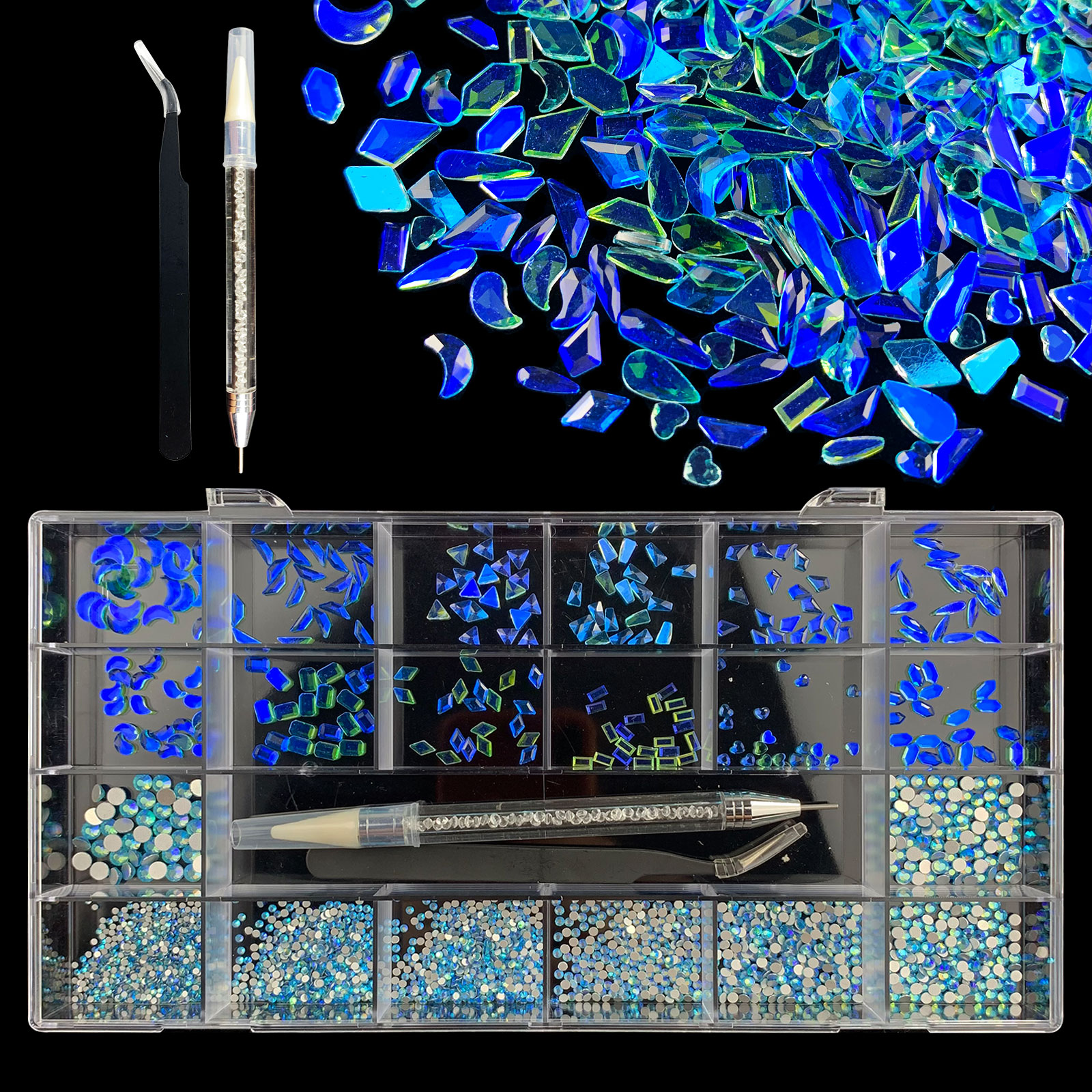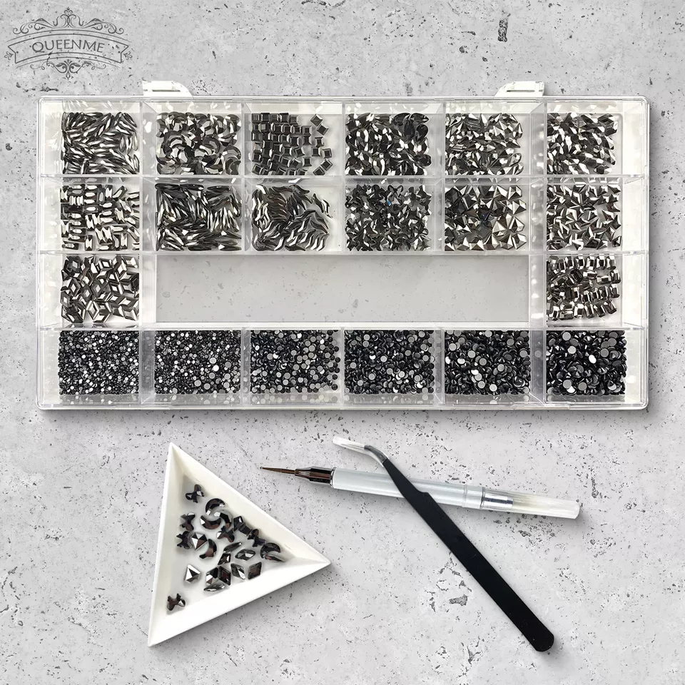 2). 2740pcs Rhinestone set: 240pcs(20x12) k9 crystal glass rhinestones, 2500pcs mix sizes round rhinestones,1pcs wax pen(Crystal or white), 1pcs tweezers for free