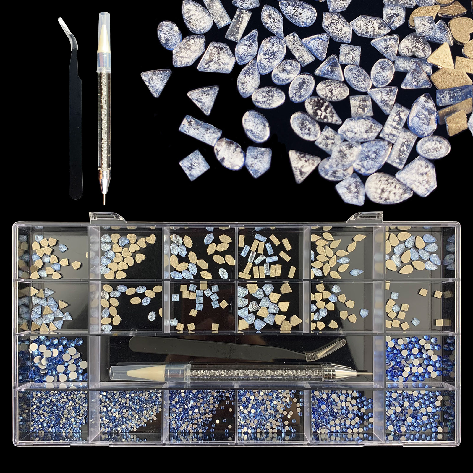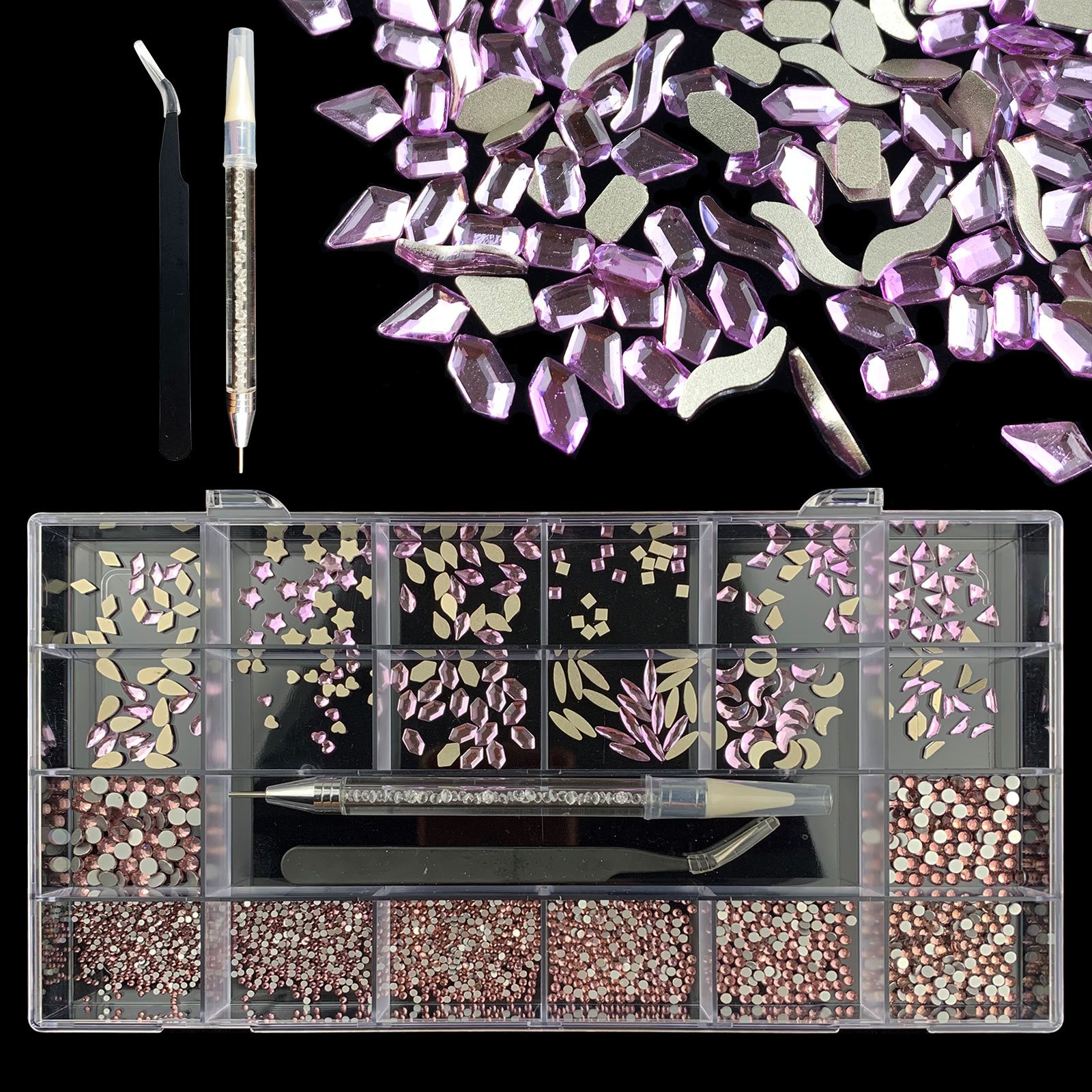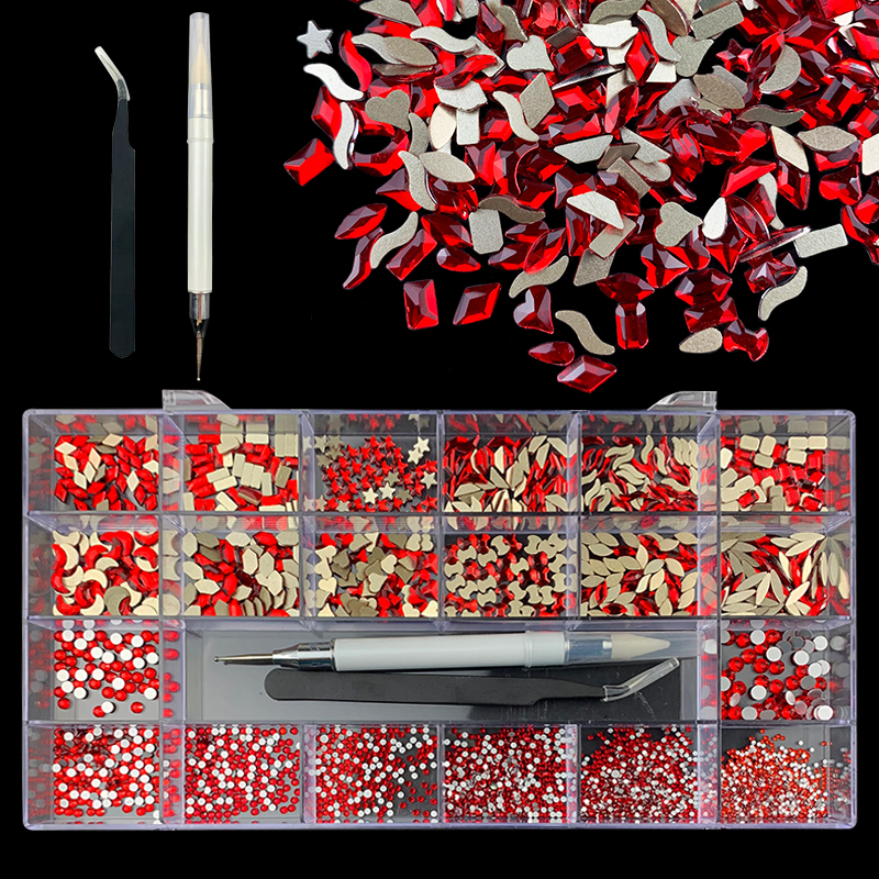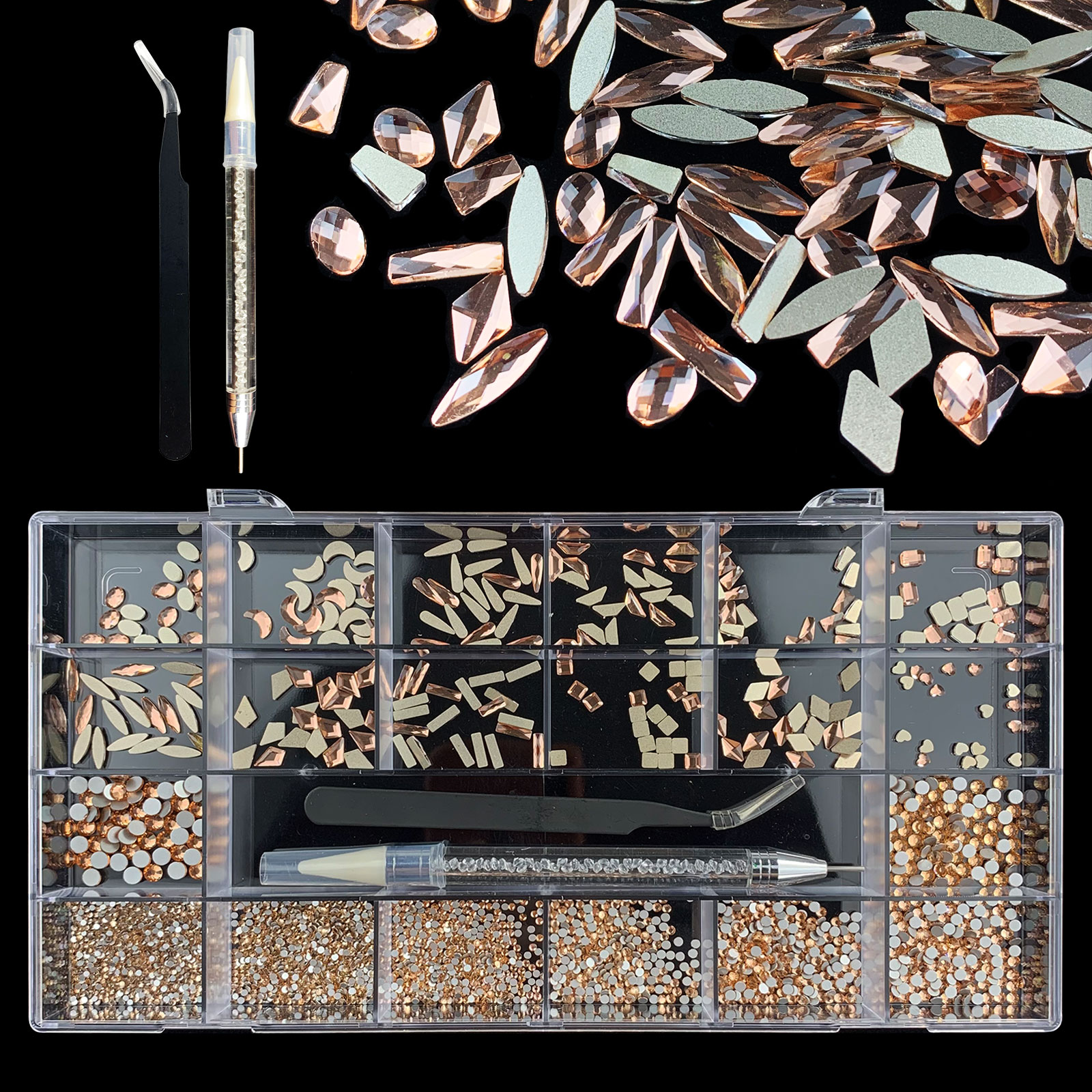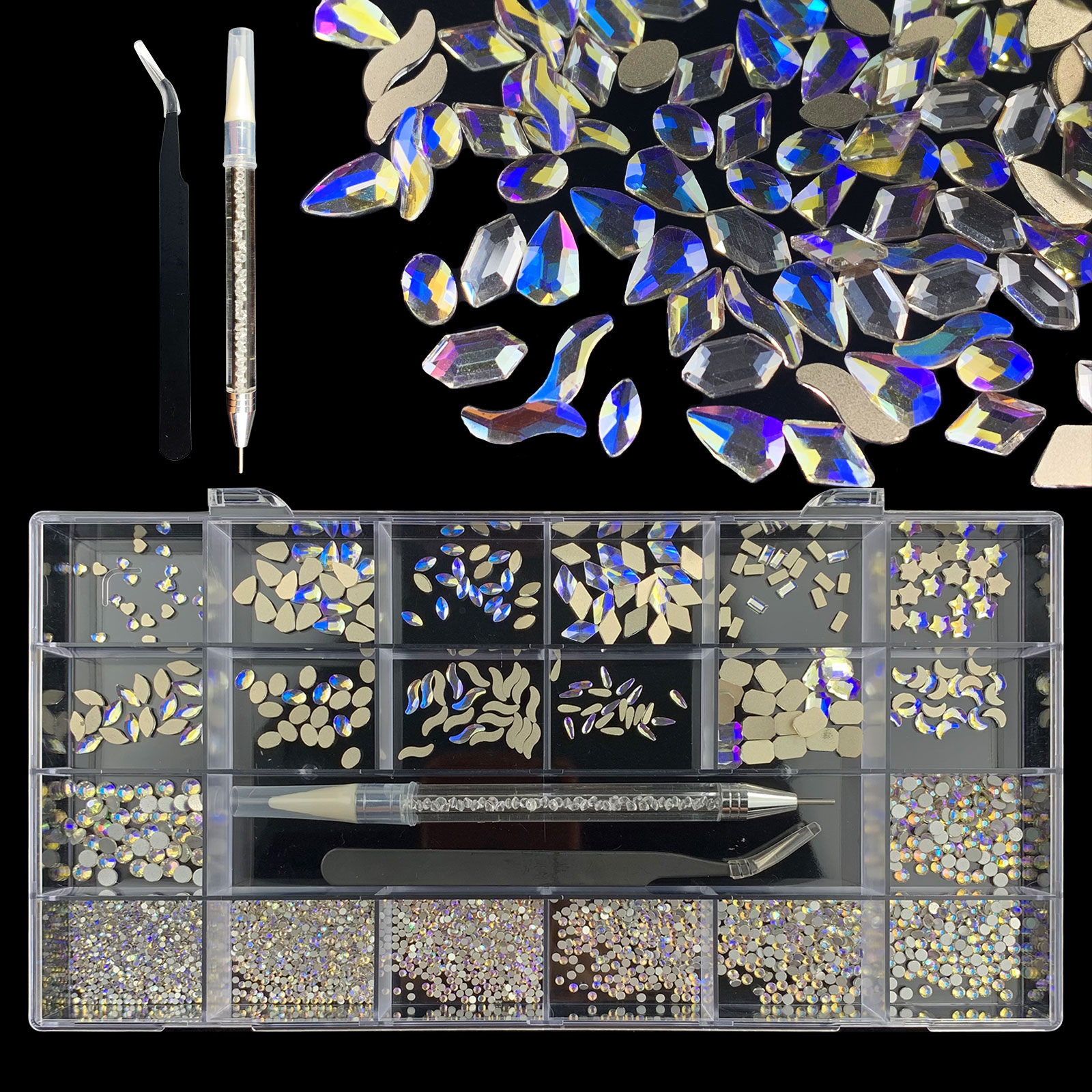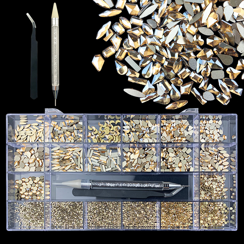 1). 2500pcs Rhinestone set: 300pcs(25x12) k9 crystal glass rhinestones, 2200pcs mix sizes round rhinestones, 1pcs wax pen(Crystal or white), 1pcs tweezers for free