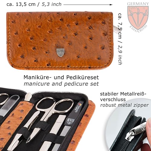 8 Piece Manicure/Pedicure Kit by 3 Swords GermanyPROS+Excellent value, best among all kits I found (reasonable price point for an overall good quality product);+Optimal array of tools: nice solid quality and exactly the tools used most often (incl 2 grades of nail files and 2 different useful scissors);+Genuine leather case with leather loops to secure tools looks durable as long as leather tool loops are not abused; leather on case is plenty thick otherwise;+Solid zipper on case does not interfere with removal of tools like with some other cases;+Case size is reasonably small + good for travel.+ Packaging is tasteful, and the high quality and general utility makes it a lovely gift for any gender.+Shipping was fast, arrived in 2 days.CONS:-While the toenail clipper seems right-sized and handles easily with its wider handle, the fingernail clipper with narrow jaws and tapered tail feels tiny and potentially more squirrelly (and maybe less durable over time? Hard to tell.). If I were keeping this kit for myself rather than gifting it, I might upgrade the fingernail clipper to a Seki.-Oddly, both clippers have a little chain attached to their tail end as if it’s expected you’ll mostly use them independent of the kit. This chain interferes with slipping the clipper back into its loop in the case, so unless you plan to carry it on a keychain you may want to remove the beaded chain.-Leather loops that hold tools could wear out if handled roughly when taking tools in/out of case, so caution is advised.I would definitely buy this product again.