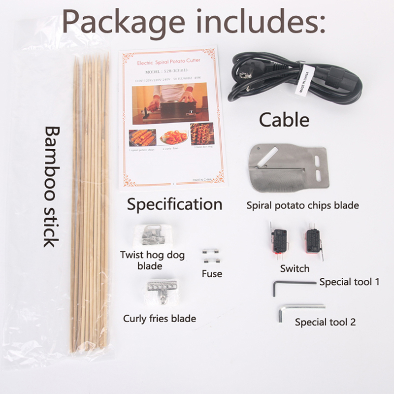 This is 3 in 1 electric potato twister machine,it can cutting twist potato,curly fries and twist hot dogthe material of blade is 420stainless steel,the blade is detachable.