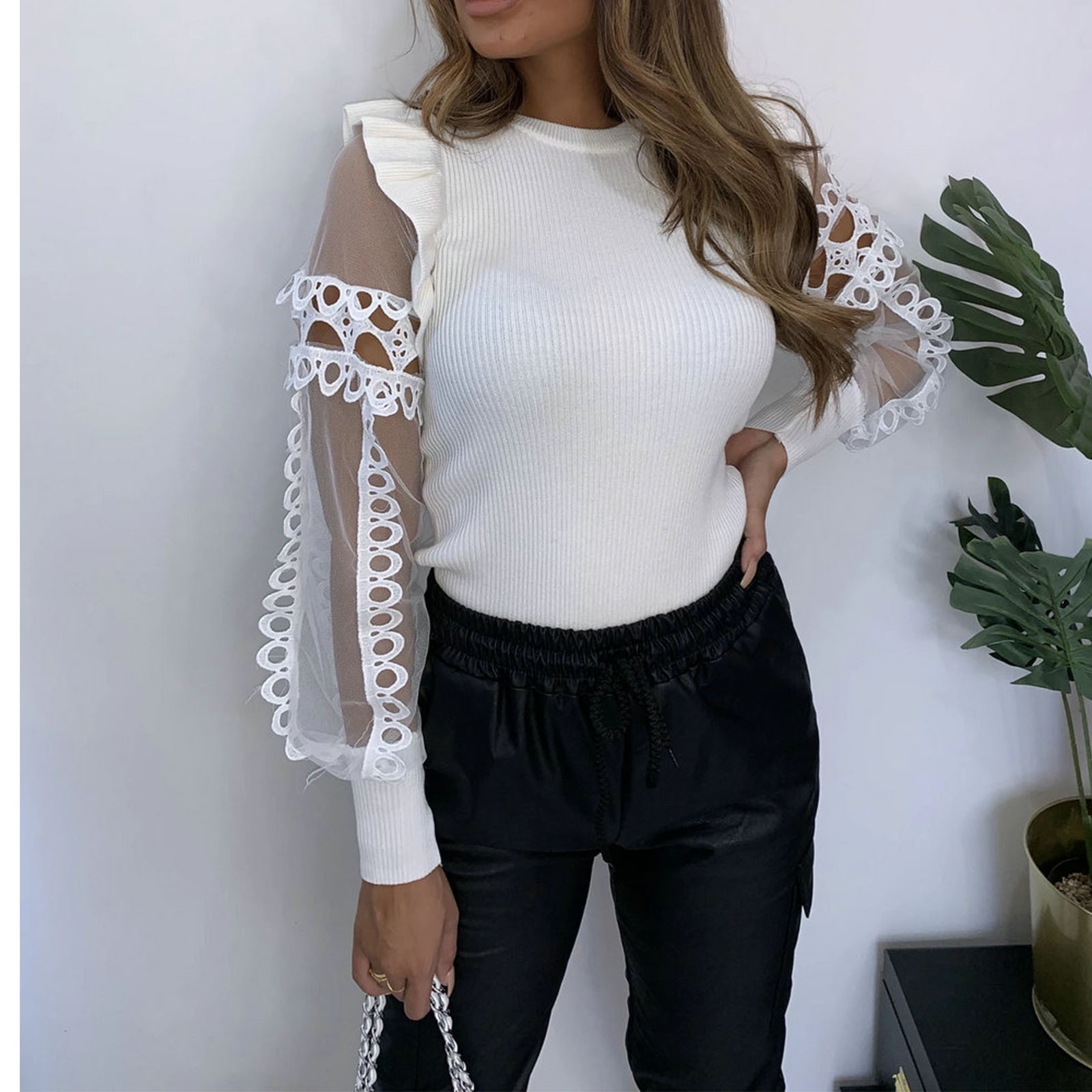 40# Women lace Blouses tops Net yarn Ruffle Casual Long Sleeve Mesh Patchwork Design Blouses Top Round neck sexy Shirts рубашка