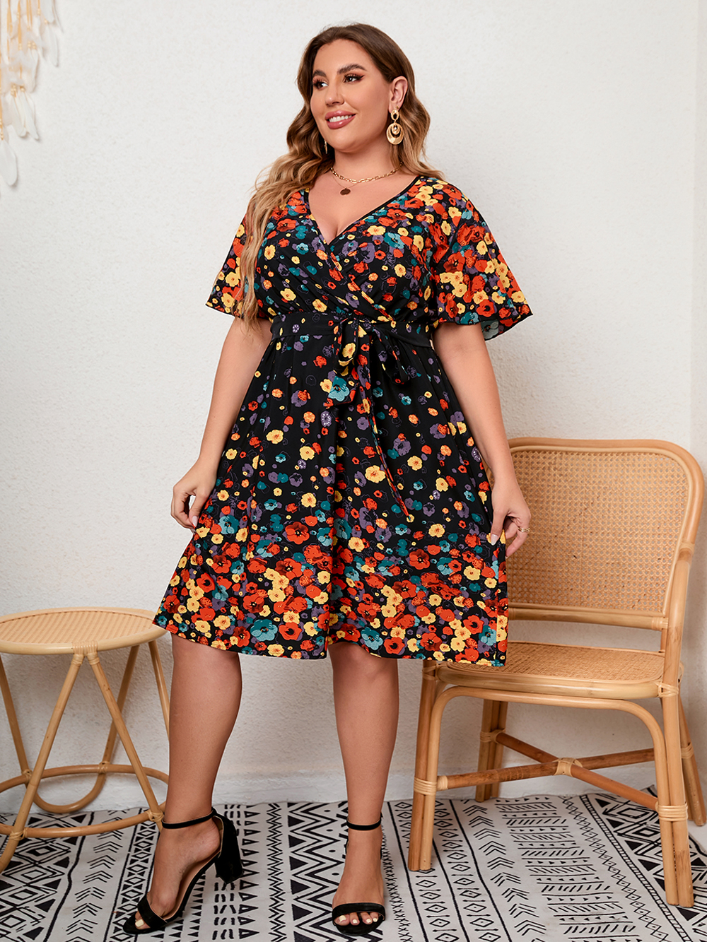 4XL 5XL Plus Size Summer Dress Woman 2022 Fashion V Neck Short Sleeve Floral Print Short Mini Dress High Waist Beach Dresses
