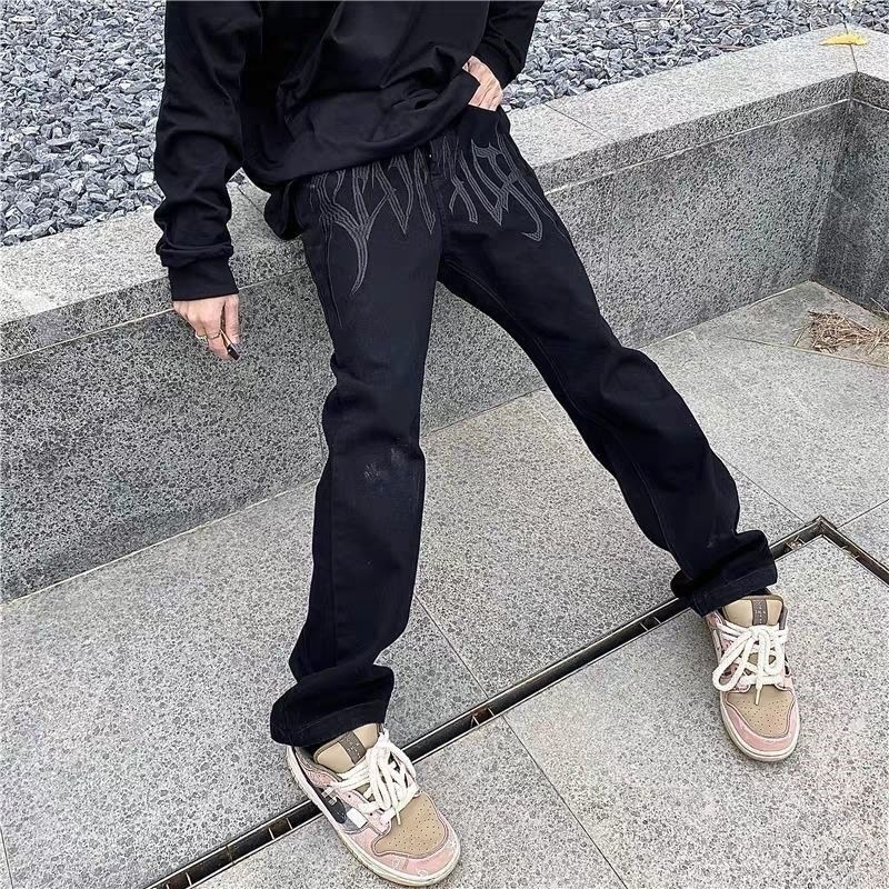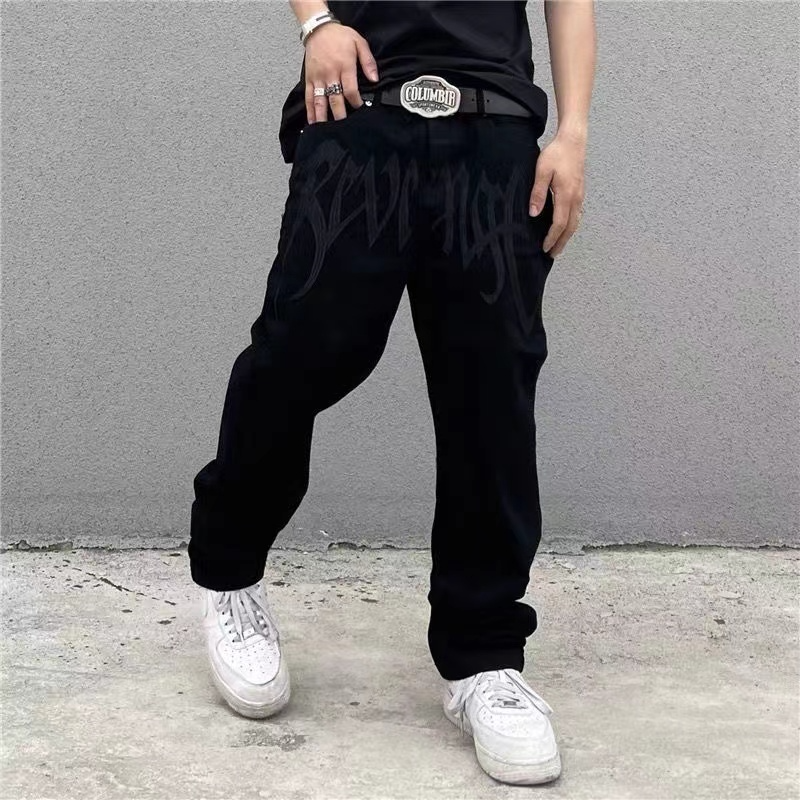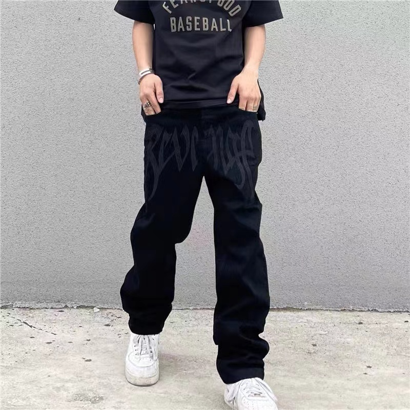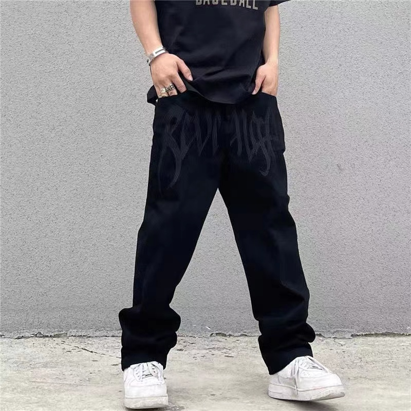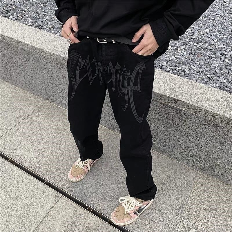 American letter embroidery straight loose jeans men Y2K street trend hip-hop retro black wide-footed oversized denim trousers