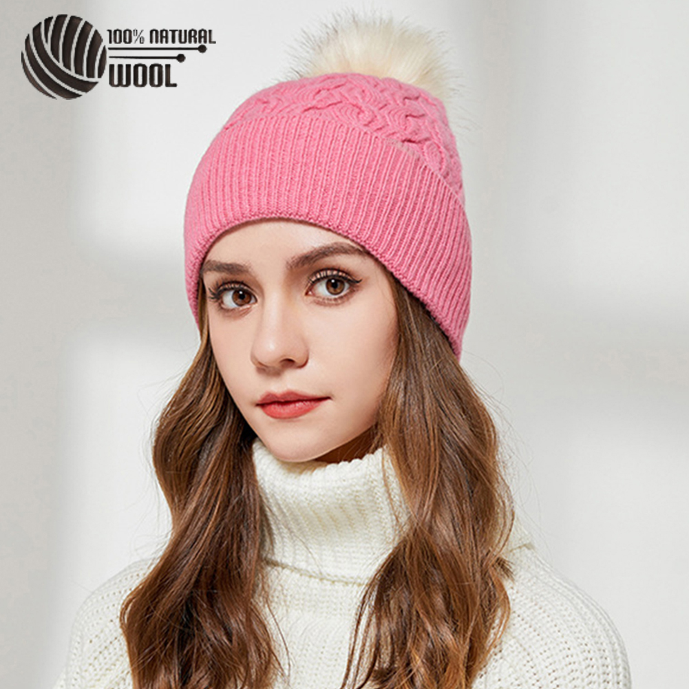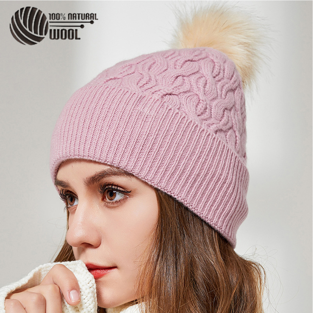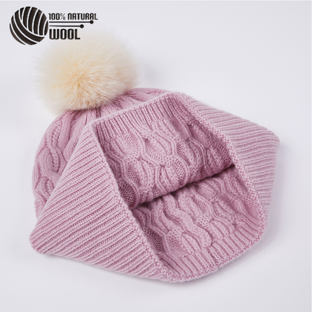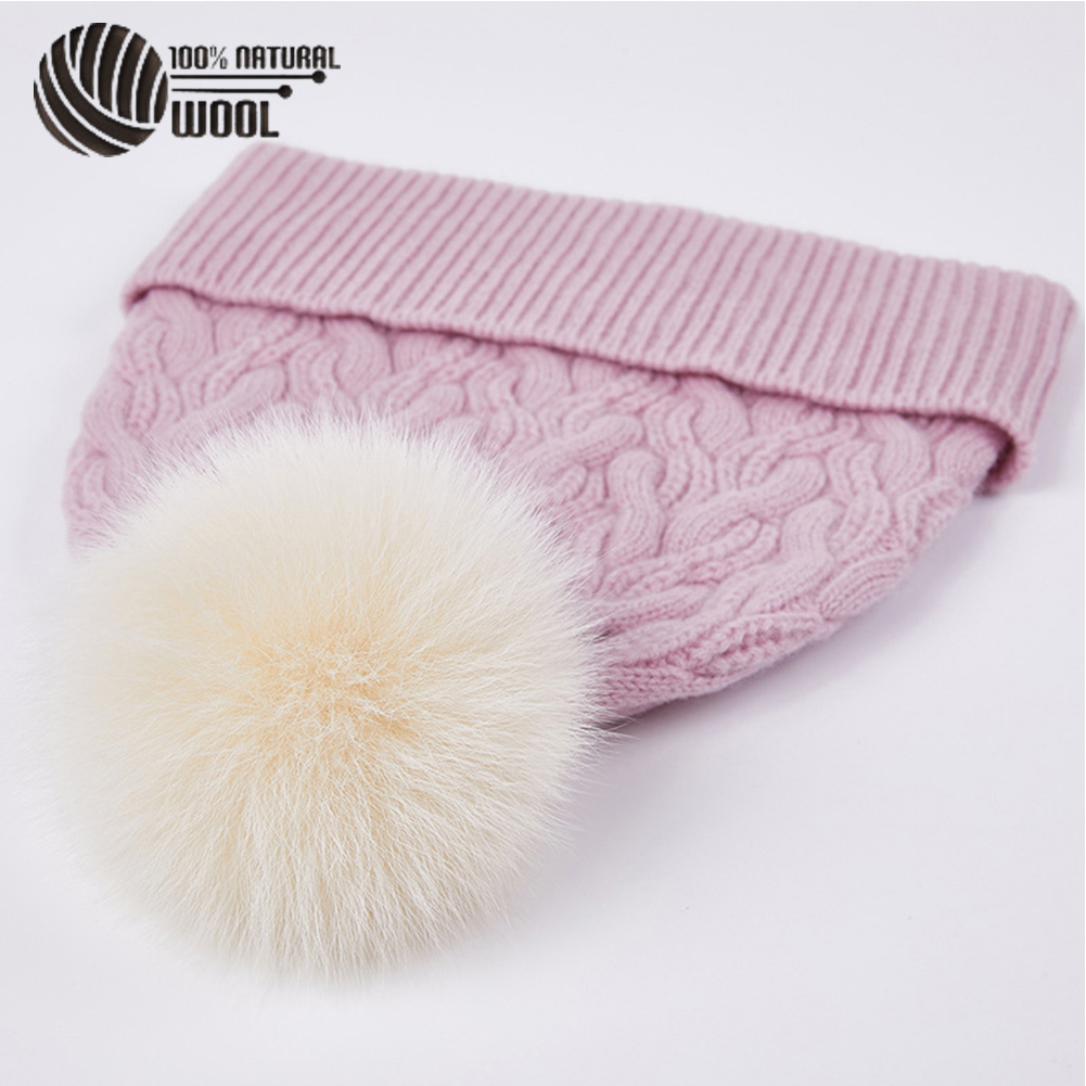 Australian Merino Wool Hat with Real Fox Fur Pompom Women Winter Knit Slouchy Beanie Cashmere Skullies Hats For Girls