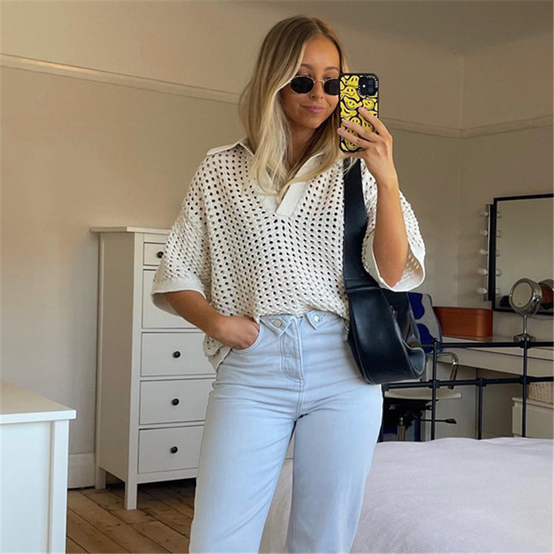 Basic Knitted Hollow Polo Women Short Sleeve Top Loose Casual Solid Color Polo Shirt Women Street Outfit Spring Summer 2022 シャツ