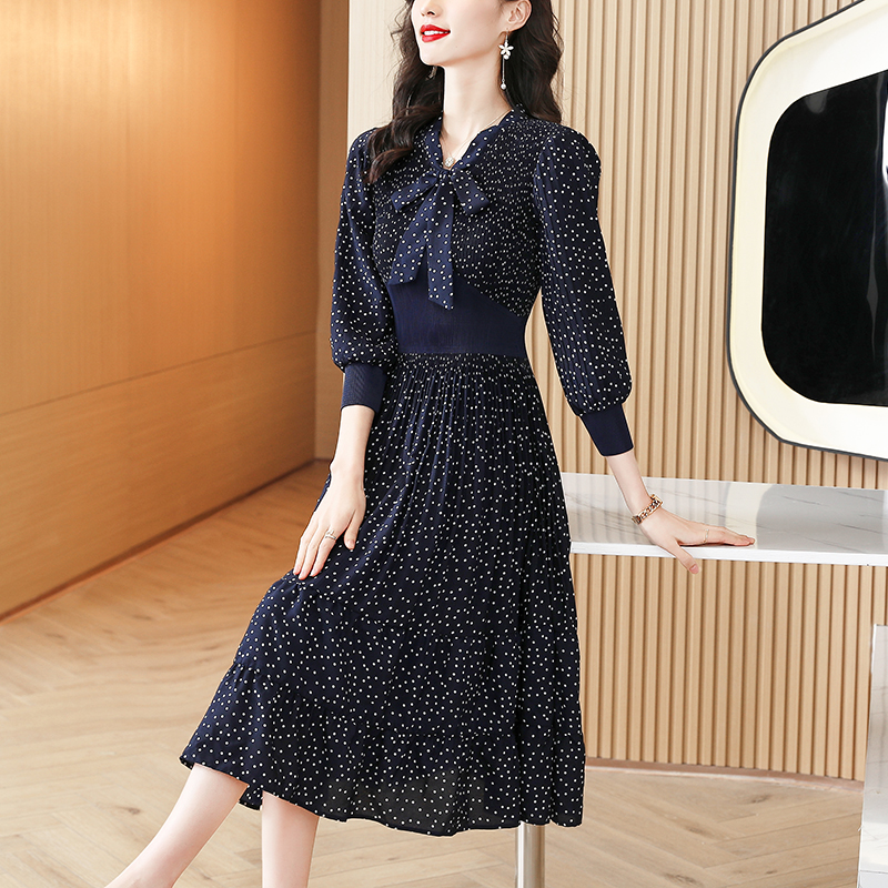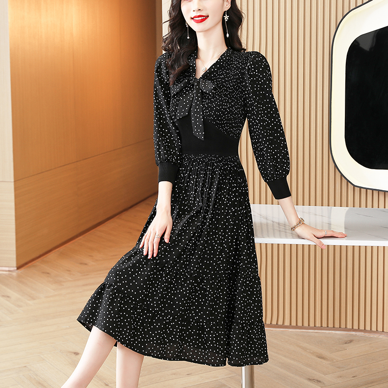 Black Polka Dot Midi Dress Spring Autumn Elegant Bodycon Pleated Dress Women Vintage Casual Party Vestidos