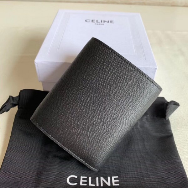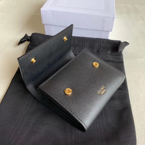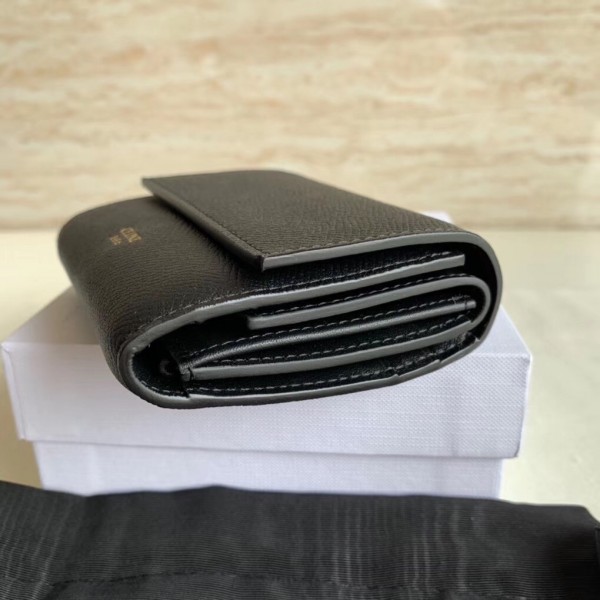 Crafted in grained calfskin leather by the House of Celine, this small trifold wallet with a flap offers enough space to fit into even a tiny bag or clutch, yet with space for coins, notes and credit cards, this neat wallet is the ultimate mini companion. Coupled with an elegant design with golden finishing touches.