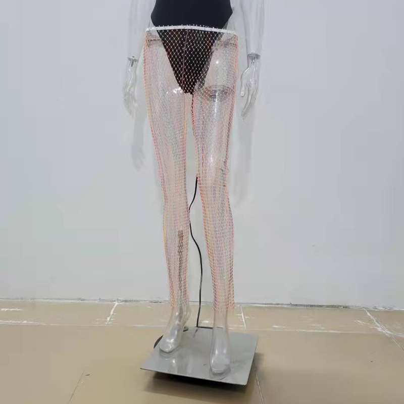 Crystal Diamond Mesh Pants Women Sexy Summer Hollow Out Transparent Loose Long Fishnet Pants BeachWear Trousers