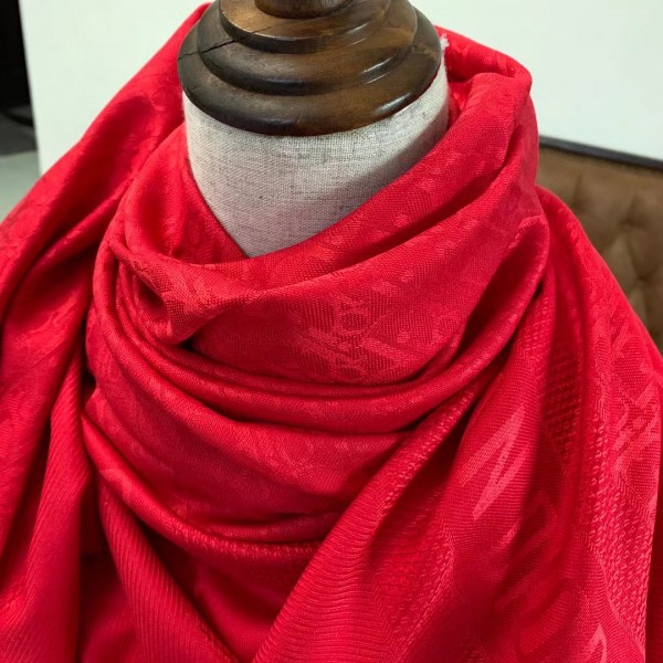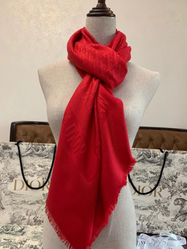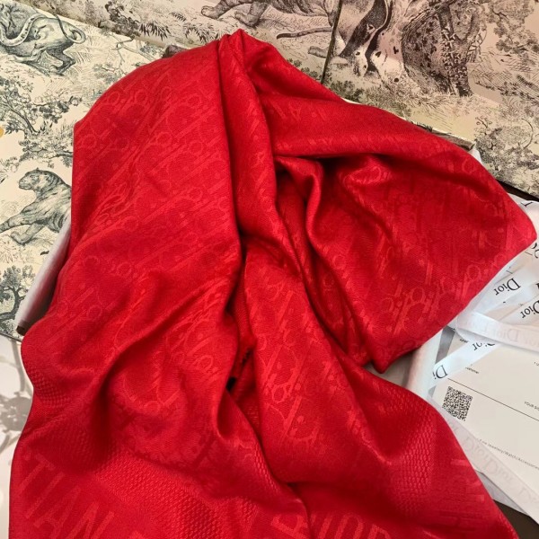 The red jacquard shawl features the Dior Oblique motif. Designed in 1967, the emblematic print covers the piece’s blend of silk, wool and cashmere. Fringed edges spotlight a tonal border with a ‘Christian Dior’ signature in capital letters. The shawl can be worn around the neck or draped over the shoulders.