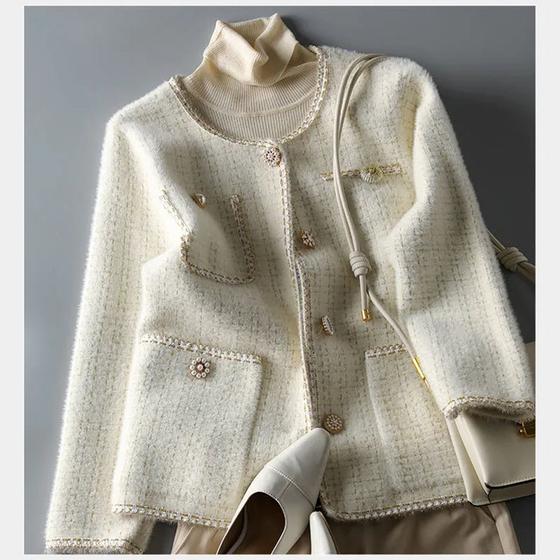 Elegant Crew Neck Soft Mink Cashmere Short Jacket Chic Pearl Button Long Sleeve Design Sweater Cardigan Style Knit Coat