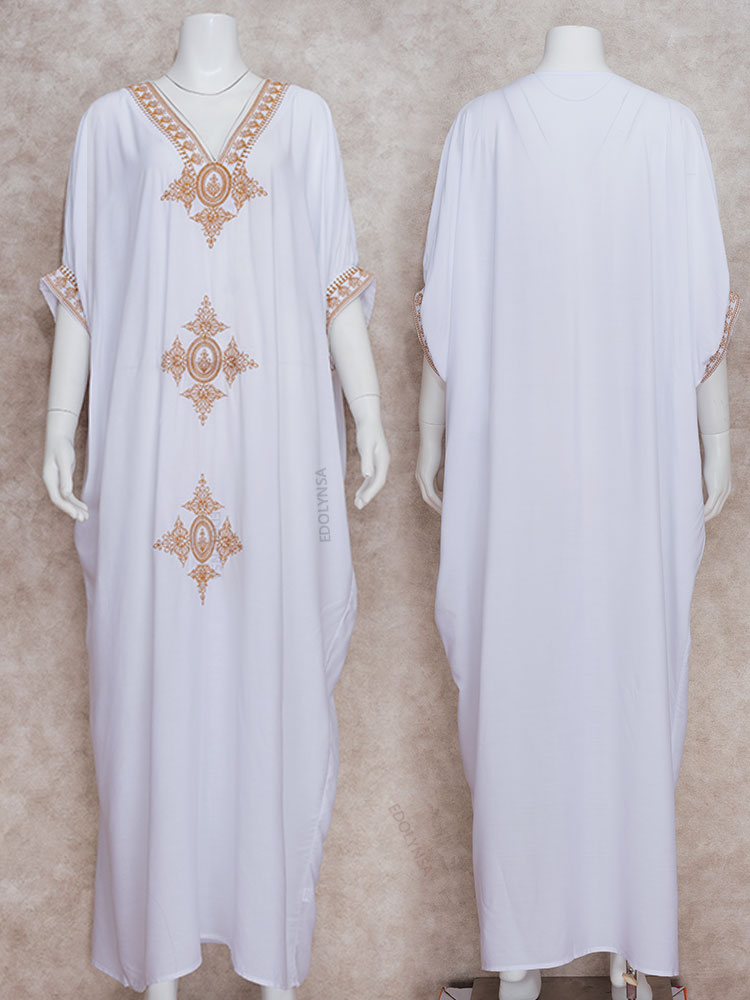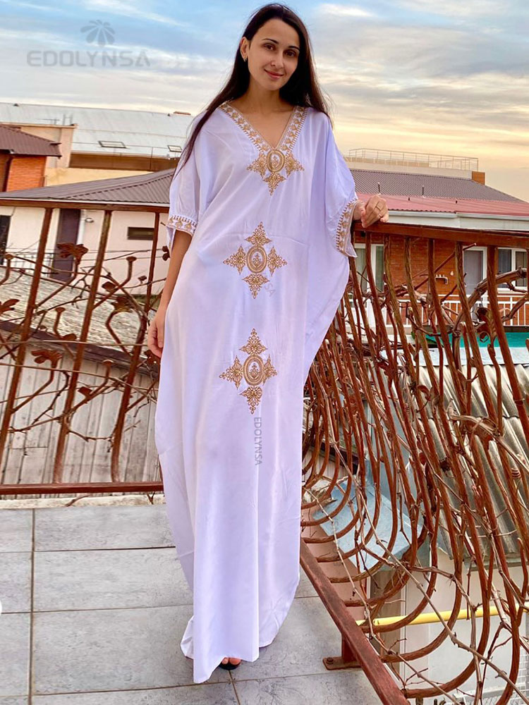 Elegant Gold Embroidered Kaftan Retro V-neck White Dress Women Clothes Summer Beach Wear Swim Maxi Dresses N1373