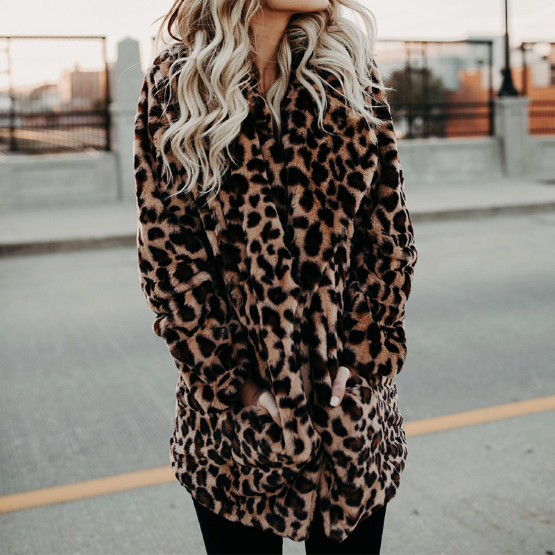 Faux Fur Coat Women Winter Leopard Print Outerwear Warm Long Sleeve Artificial Fur Jacket Plush Clothing