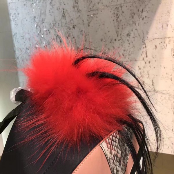 Black technical nylon backpack. Red fox fur, leather and elaphe color-block inlays, and a contrasting lined zip pocket create a Bag Bugs-inspired design. Adjustable padded shoulder straps and technical mesh backing. Double zip closure and inner pocket.