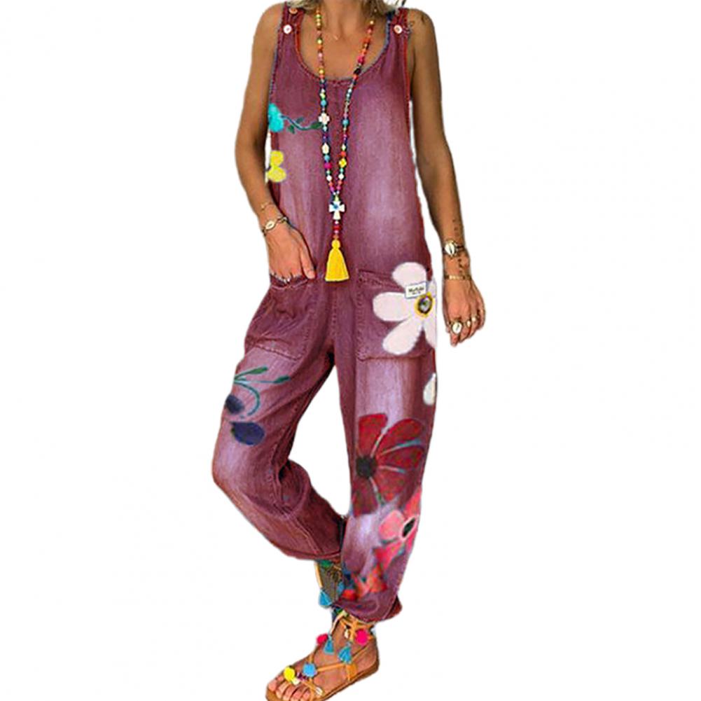 Women will be more beautiful and trendy wearing this loose fit jumpsuit with flower print, sleeveless, u-neck and deep pockets design.