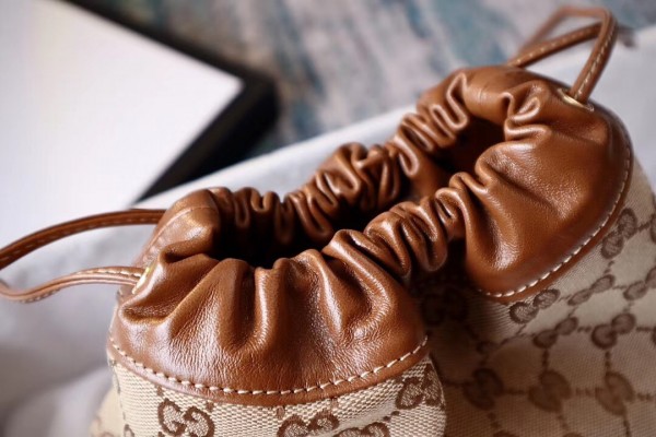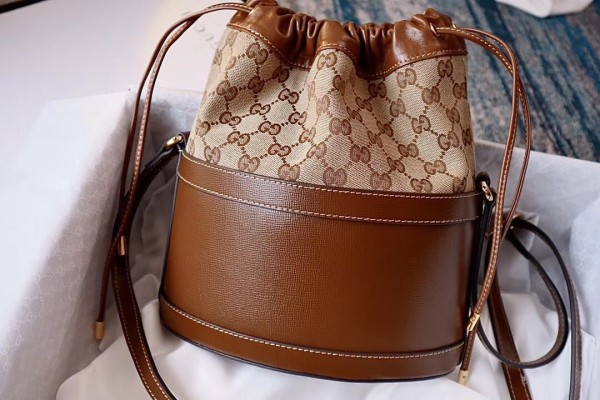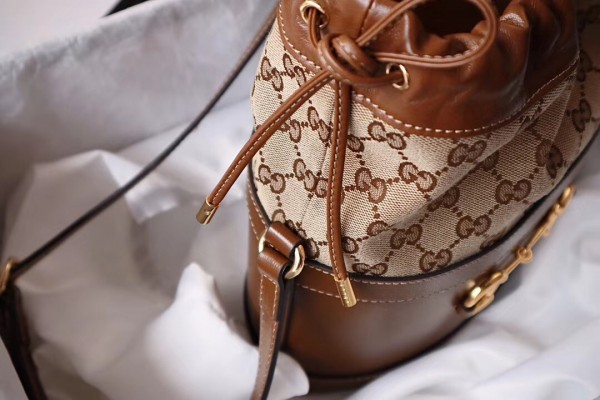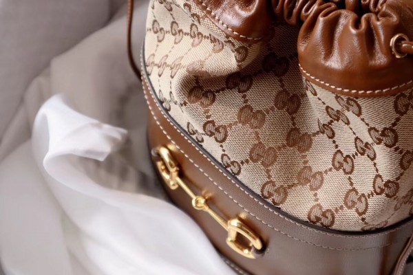 Inspired by archival designs, Gucci 1955 Horsebit bucket bag unifies the original details first introduced over six decades ago with a modern spirit, highlighting the Horsebit. Part of Gucci’s genetic code, the double ring and bar design has been established as one of the most distinctive elements among the House symbols borrowed from the equestrian world. The hardware is paired with a contemporary mix of materials and colors, combining the House’s GG canvas with textured brown leather.