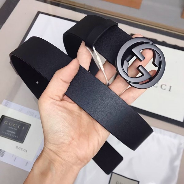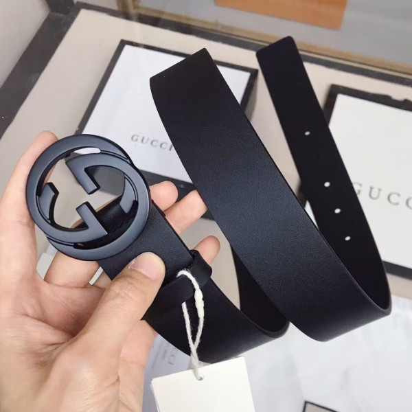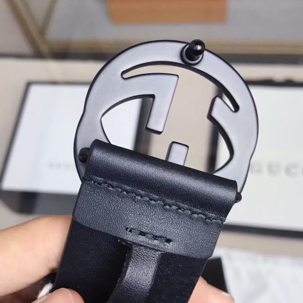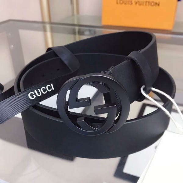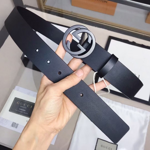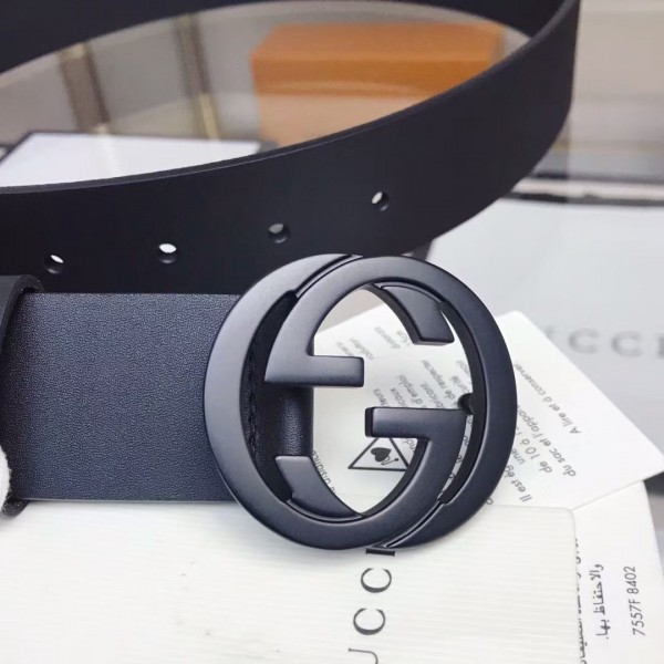 Brand new, Gucci belt comes in sleek black leather with an interlocking GG matte black buckle, making this the perfect belt to match with just about any outfit. This classic Gucci belt is a true staple piece.