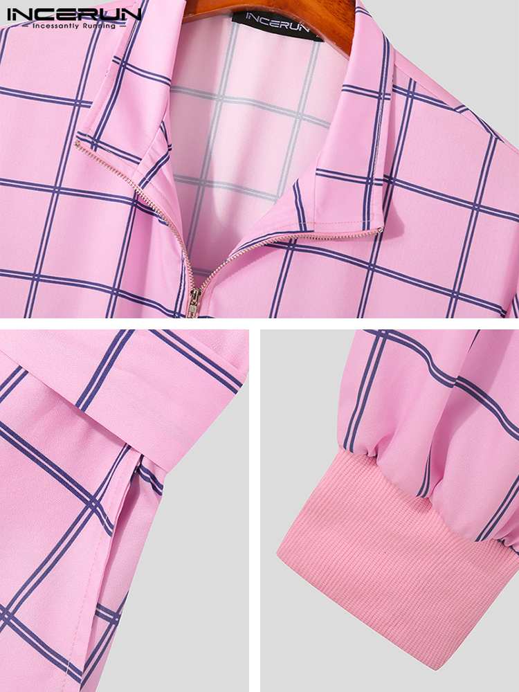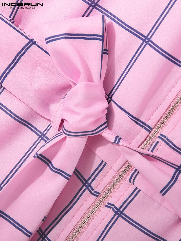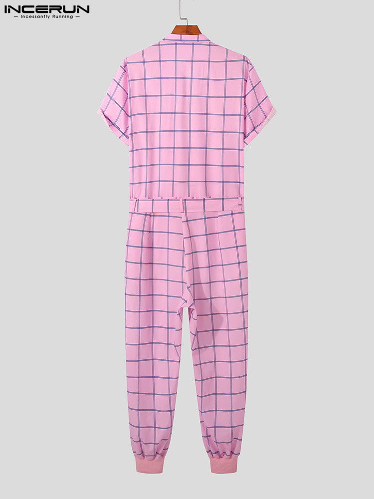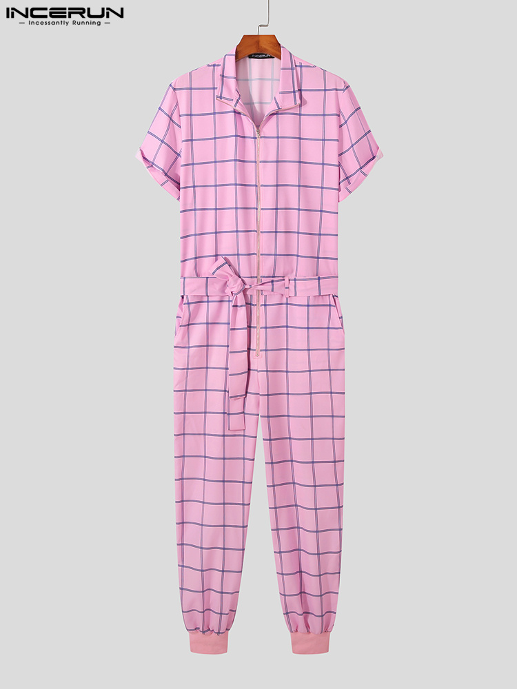 INCERUN Men Plaid Jumpsuits Lapel Short Sleeve Zipper Rompers With Belt Streetwear Summer Casual Men Overalls S-5XL