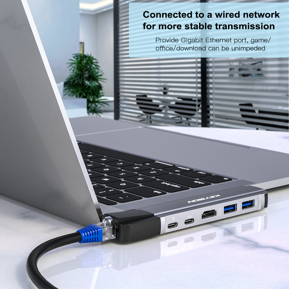 - 6 in 1 USB HUB :Thunderbolt 3*1, HDMI*1, USB 3.0*2, RJ45*1, Type-C USB-C Data transmission *1