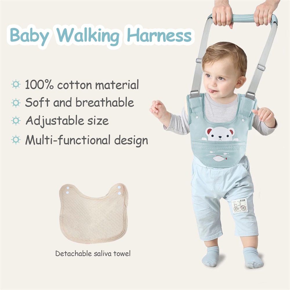 1.this baby walker harness toddler walking harness assures the safety and comfortable while learning to walk. And the high quality material for baby walking helper has good air permeability, can be used in all seasons.