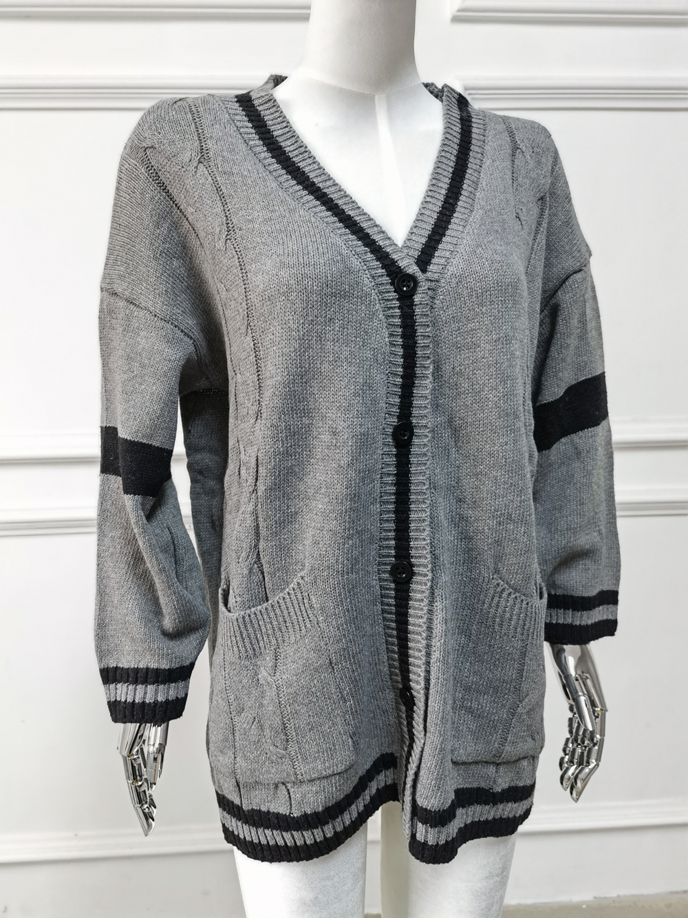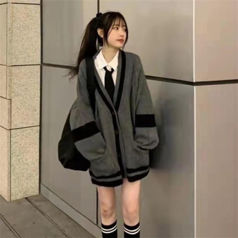Long Sleeve V Neck Preppy Style Knitted Sweater Women Autumn Single Breasted Cotton Warm Cardigan Patchwork Grey Long Sweaters