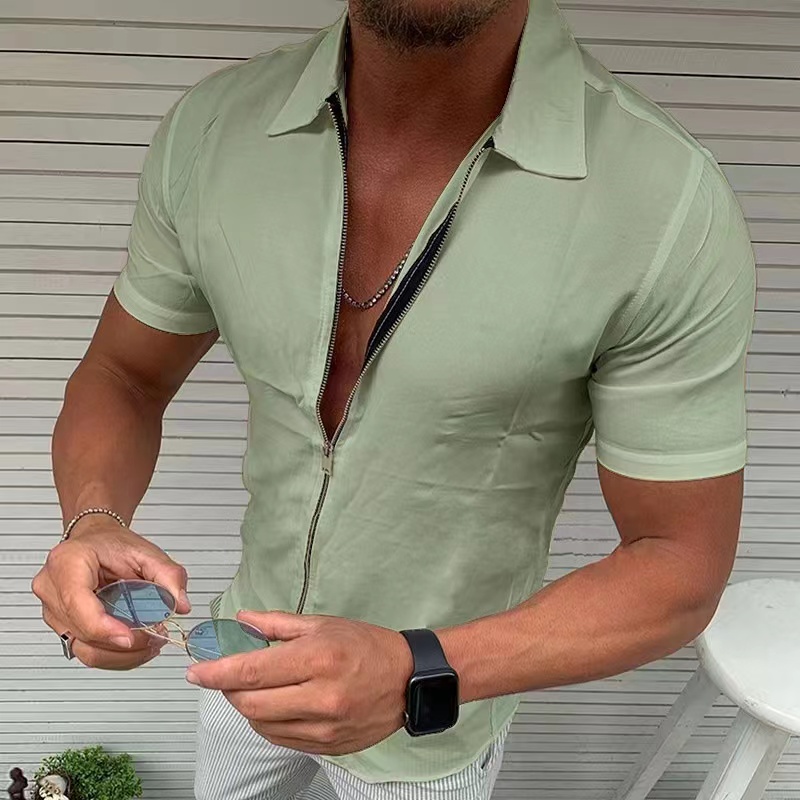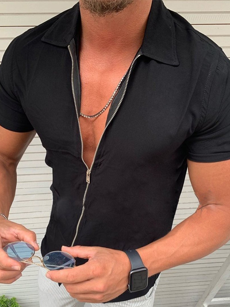 Men's Shirts Summer Men's Tide Simple Solid Color Casual Short Sleeve Zipper Shirt Cardigan