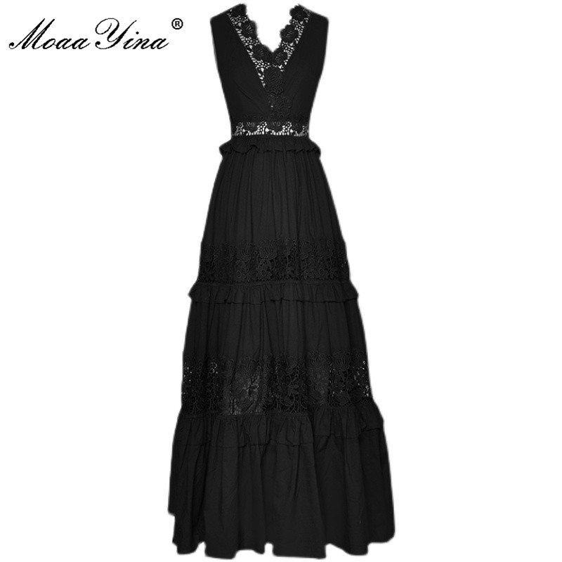 MoaaYina Runway Summer Black Party Dresses Women's Holiday V-neck Sleeveless High waist Hollow out Lace Long Dress