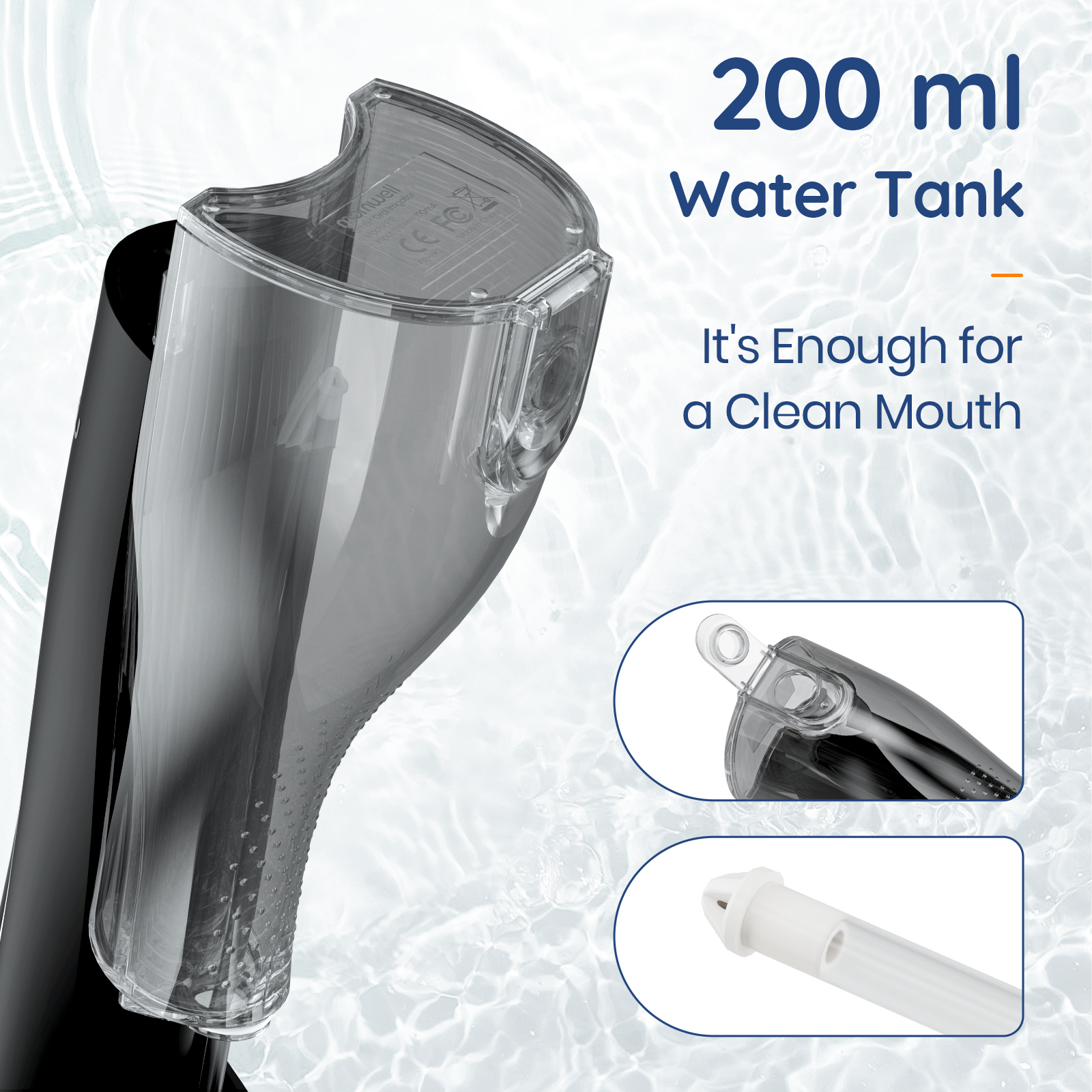 5.Features: Multifunctional / IPX7 Waterproof / 3 Adjustable Work Modes / Strong Water Pressure / Convenient Portable USB Charging / Detachable Large Capacity 200ml Water Tank / 5 x Different Function Nozzles,1 x Cleaning Brush / 360° Rotating Nozzles / Unique Gravity Ball Design / Waterproof Plug & Dustproof Plug Design