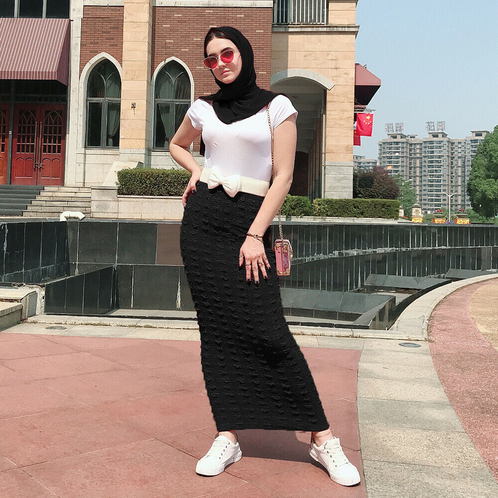 Muslim Women Maxi Skirts High Waist Buttons Knitted Stretch Bodycon Sheath Long Skirt Solid Femme Pencil Skirts Abaya Islamic