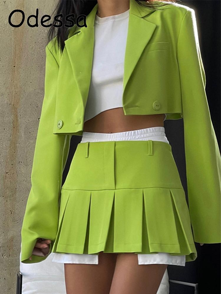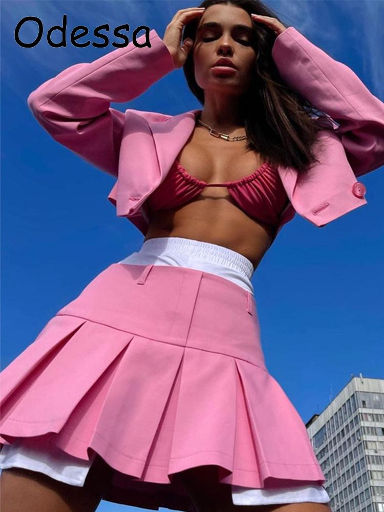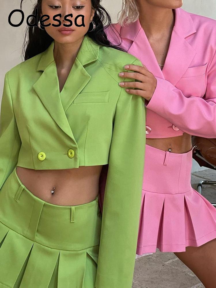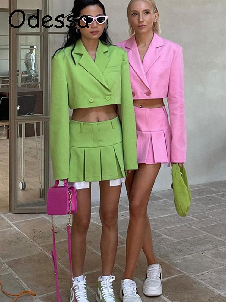 Odessa Small Fragrance Vintage Two Piece Set Blazer Office Women Button Pockets Short Jacket Coat+Mini Skirts Sets Sweet