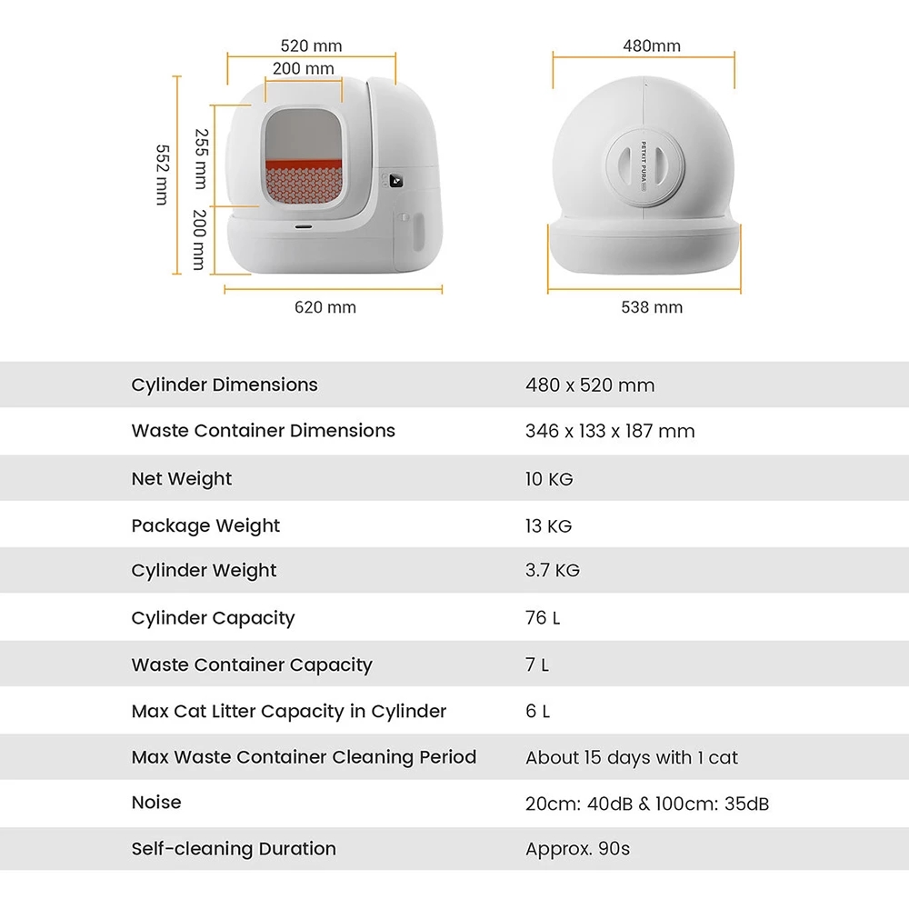 EXTRA-LARGE CAPACITY The extra-large waste container allows up to 15 days free of scooping for one cat. Moreover, PURA MAX offers a spacious interior with the capacity for cats heavier than 3.5lbs and older than 6 months.