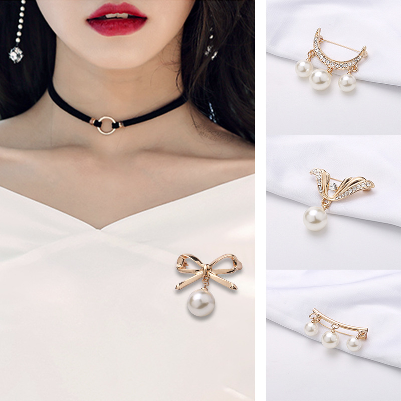 Pearl Brooch Fixed Strap Charm Safety Pin For Women Sweater Dress Clothe Small Brooch Cardigan Clip Chain Lapel Neckline Jewelry