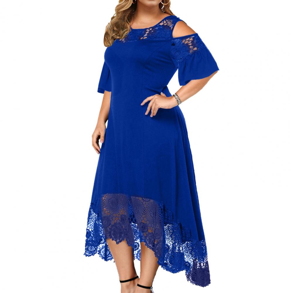 Plus Size Women Dress Flare Short Sleeve Cold Shoulder Embroidery Elegant Dress Party Lace Patchwork High-low Hem Dress Summer