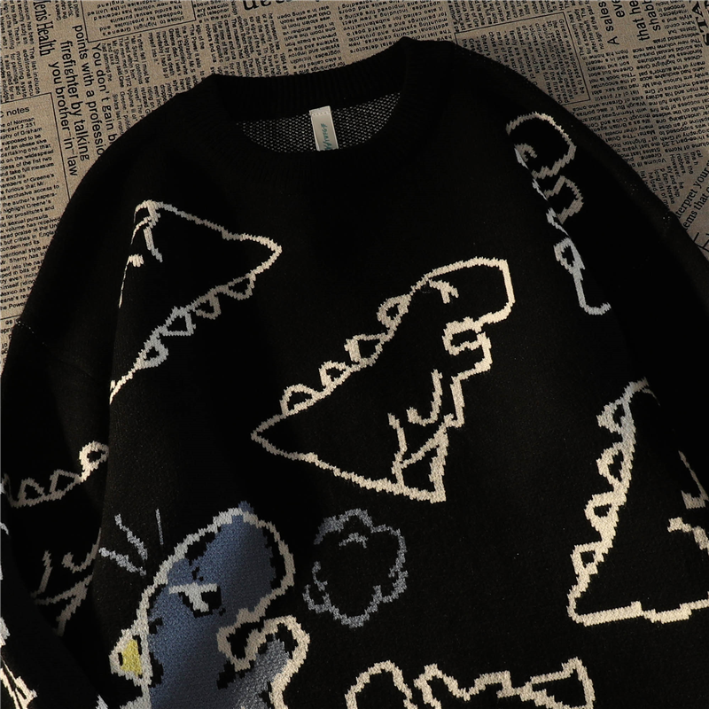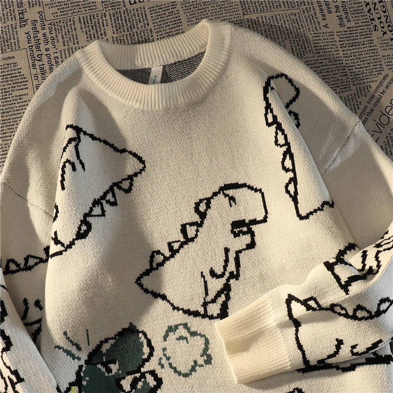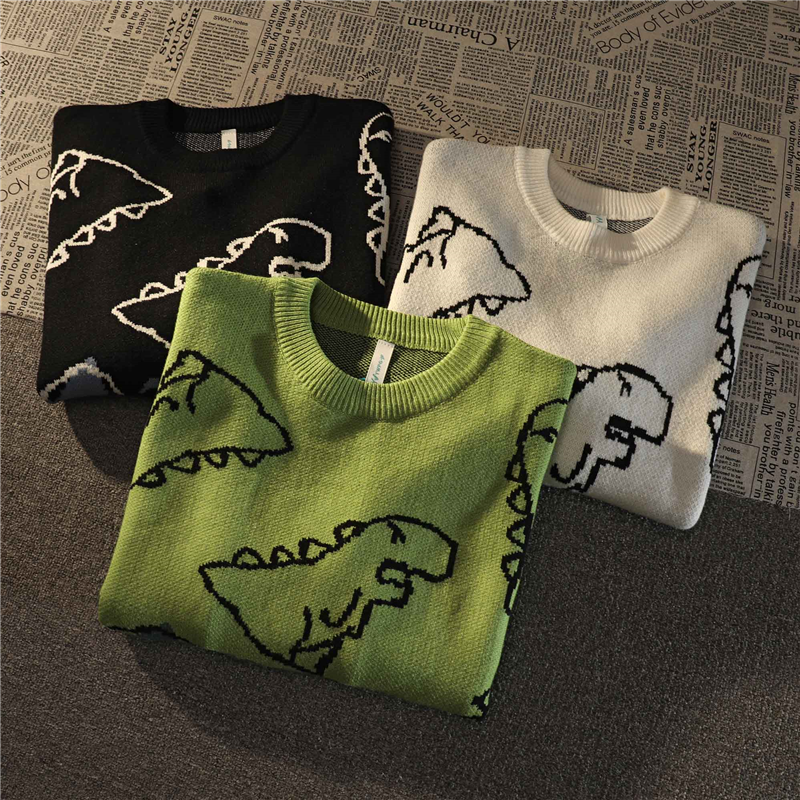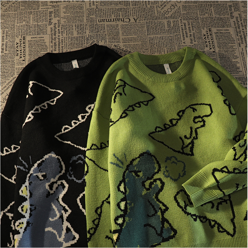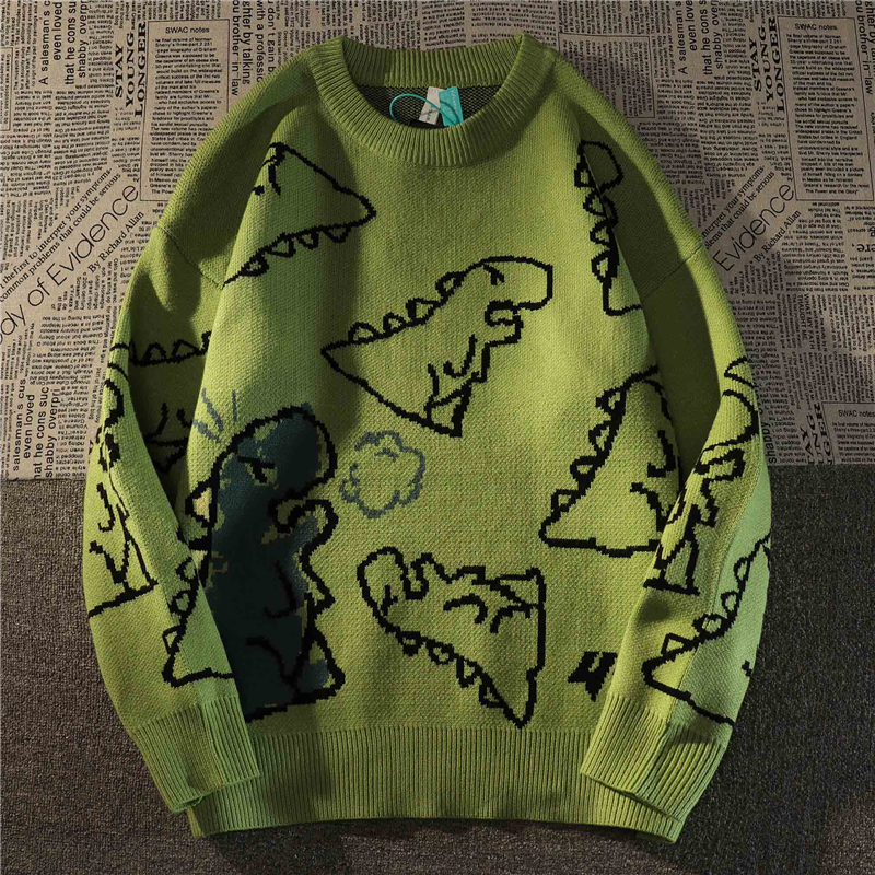 Retro Japanese Full Print Dinosaur Green Sweater Women's Autumn And Winter Loose Cute Pullover Sweater Female Tops Coat