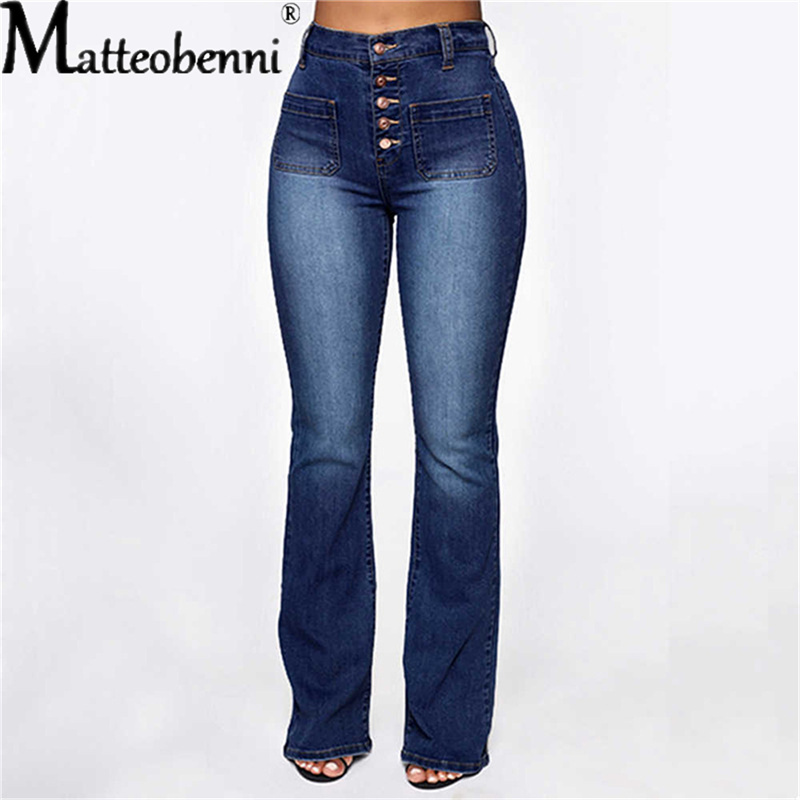 Sexy High Waist Elastic Jeans Women Button Washed Denim Pants Femme Pocket Trouser Bootcut Straight Leg Jeans Mujer