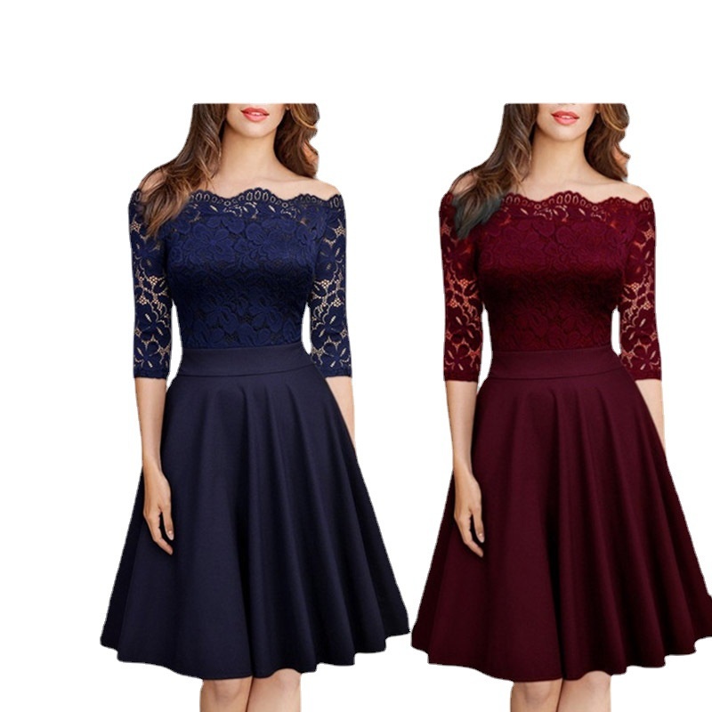 Summer Solid Color One Word Collar Dress Women Clothing Elegant Strapless Pleated Mid Calf Lace Dress Daily Evening Dresses