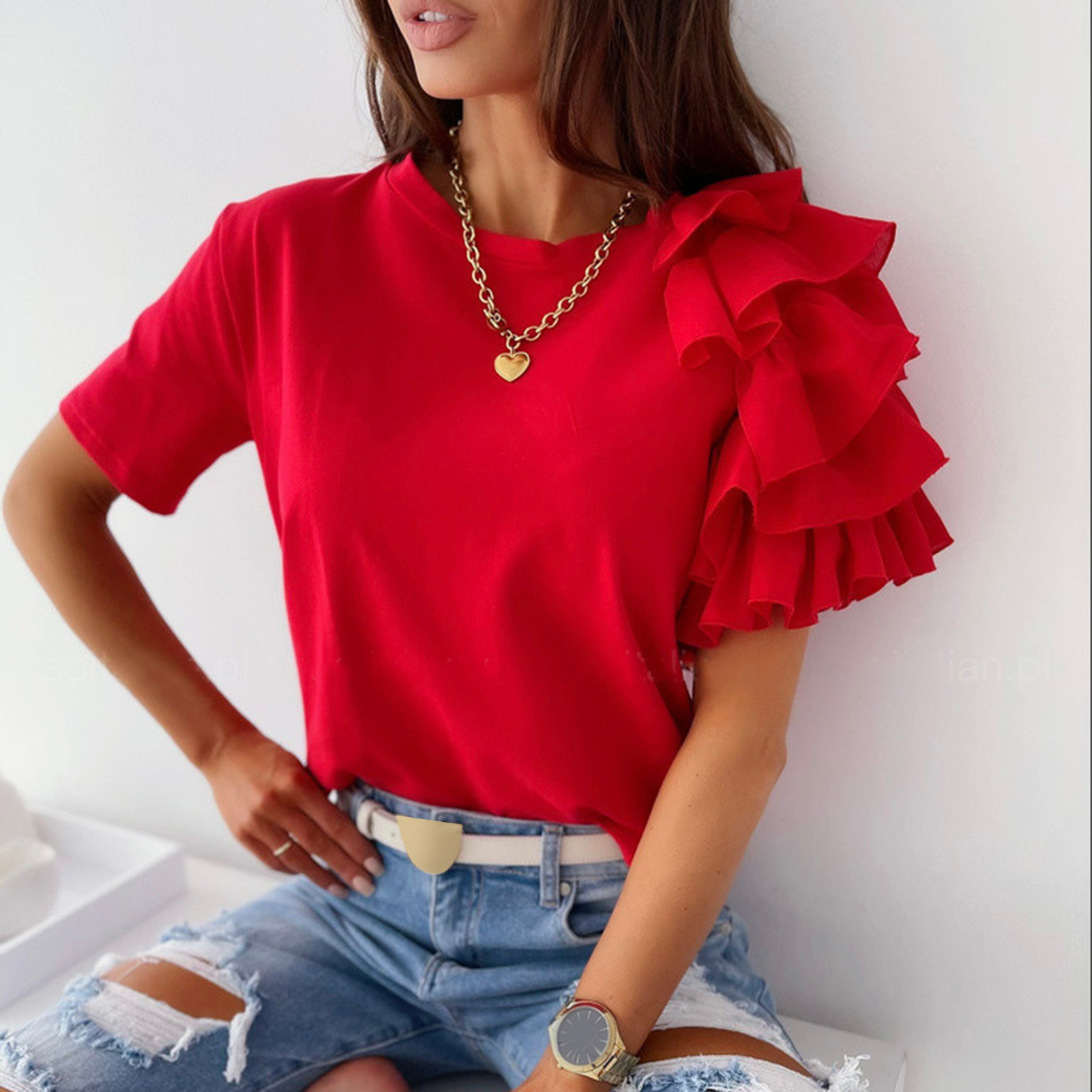 Summer Women T-shirt Top Lotus Sleeve Lace Crew Neck Women Loose T-Shirt Elegant Summer Streetwear vetement femme