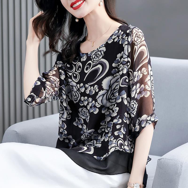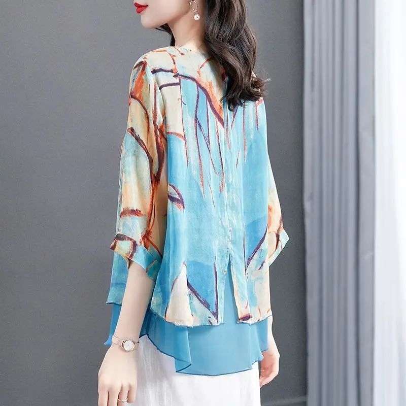 Summer Women Print Splice Casual Chiffon Blouses Shirts O-Neck Loose Tops Blusas Large SizeMM0132