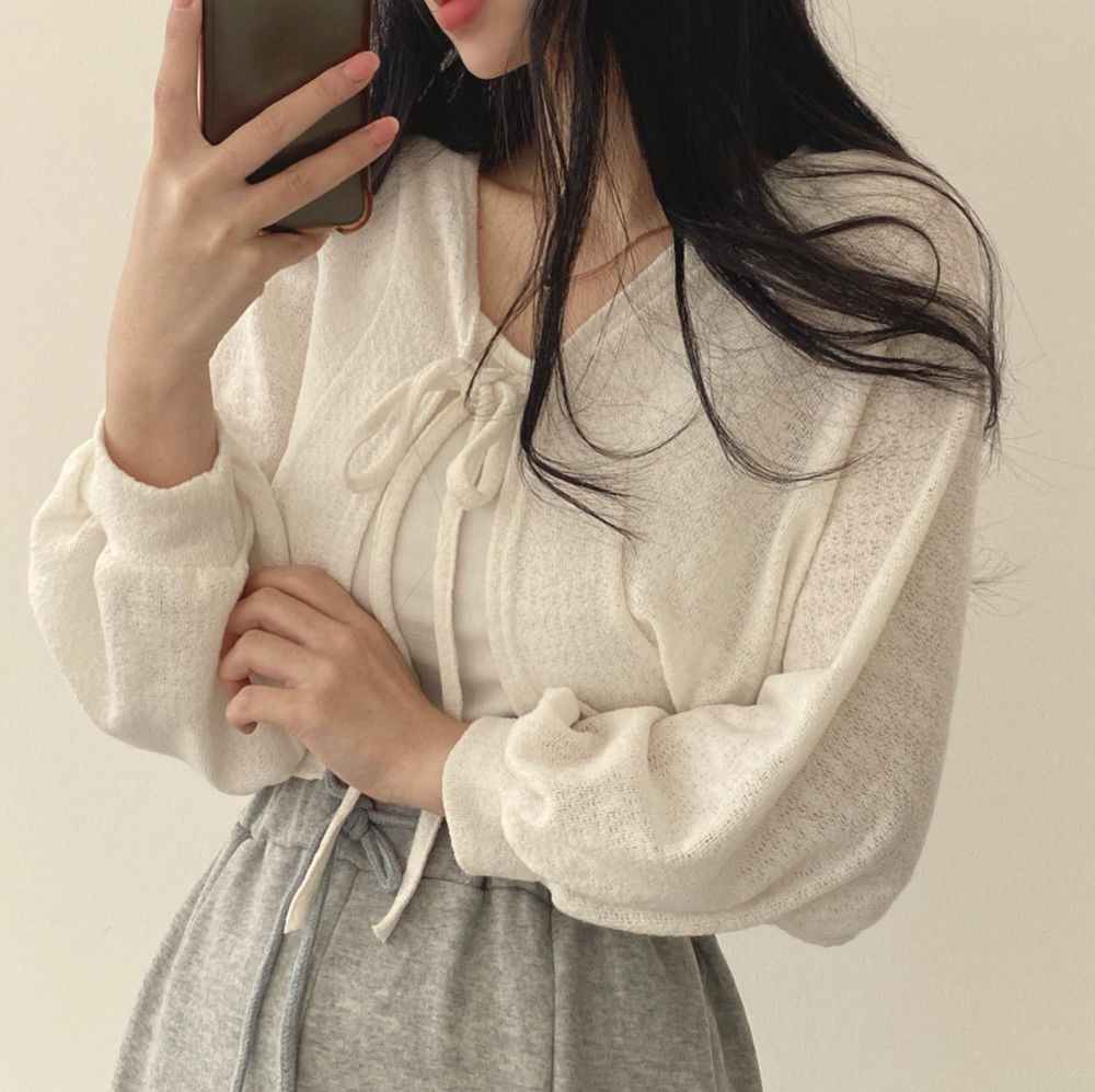 Thin White Cardigan Bandage Lantern Sleeve Short Coat Pull Femme Knitwear Top Girl Cardigan Style Casual T Shirt
