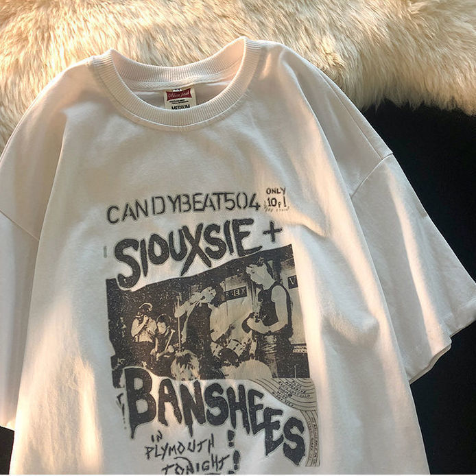 Vintage Harajuku style short sleeved T shirt for in summer versatile American print loose student half sleeved top for couples