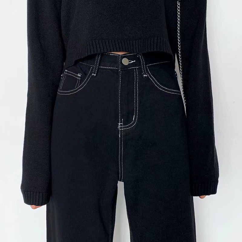 Vintage high waist black jeans women version of ins loose and thin wide-leg pants college style wild straight-leg pants