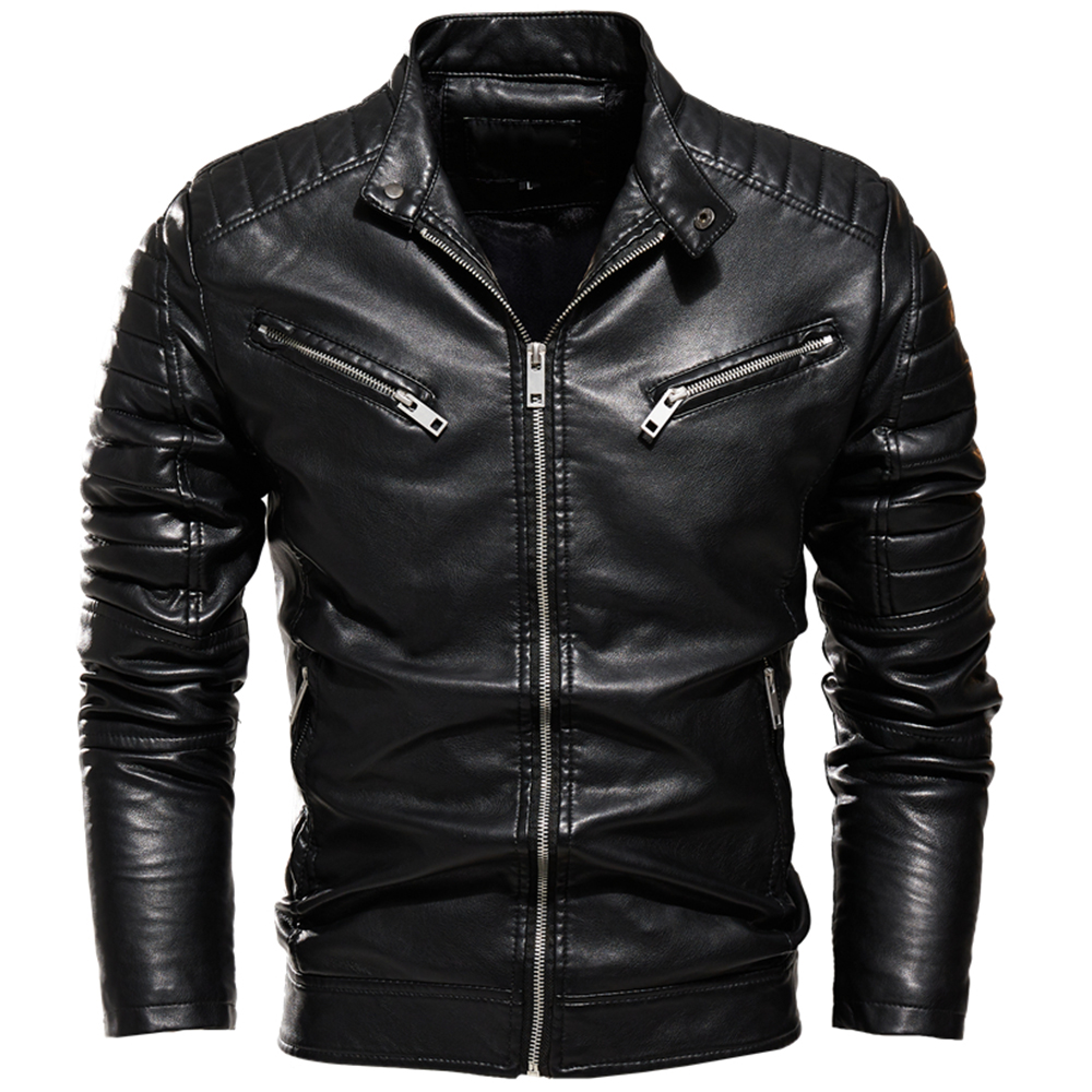 Winter Black Leather Jacket Men Fur Lined Warm Motorcycle Jacket Slim Street BLack Biker Coat Pleated Design Zipper