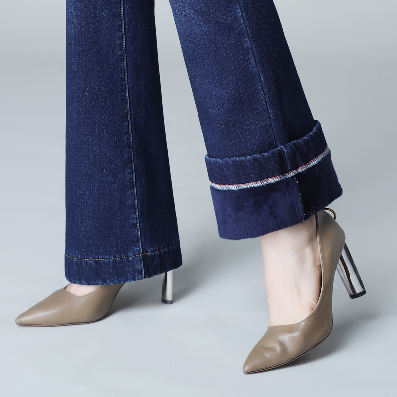 Winter Fleece Flared Pants Jeans Women High Waist Stretch Slim TWide Legs Hick Velvet Female Denim Trousers