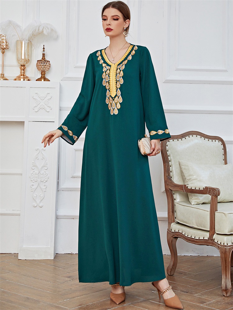 Women Dress Female Casual Spring Summer Embroidery Long Green Dress Loose Waist Dot Print National Style Retro Clothing