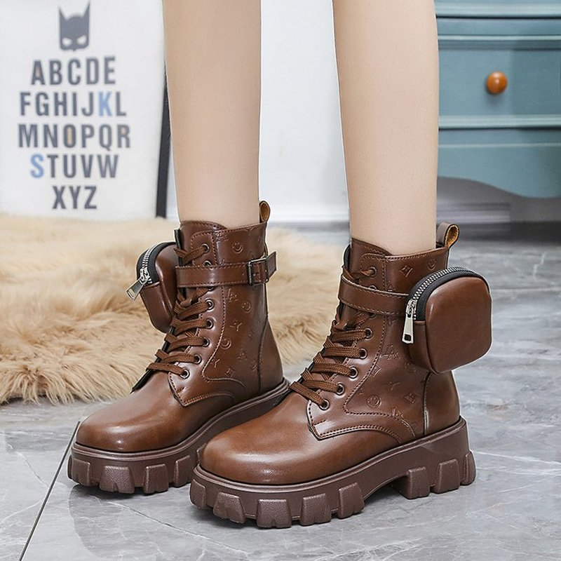 Women Thick-Soled Leather Boots Casual Women Boots Women Lace-Up High Boots Nylon pouch heels flats booties