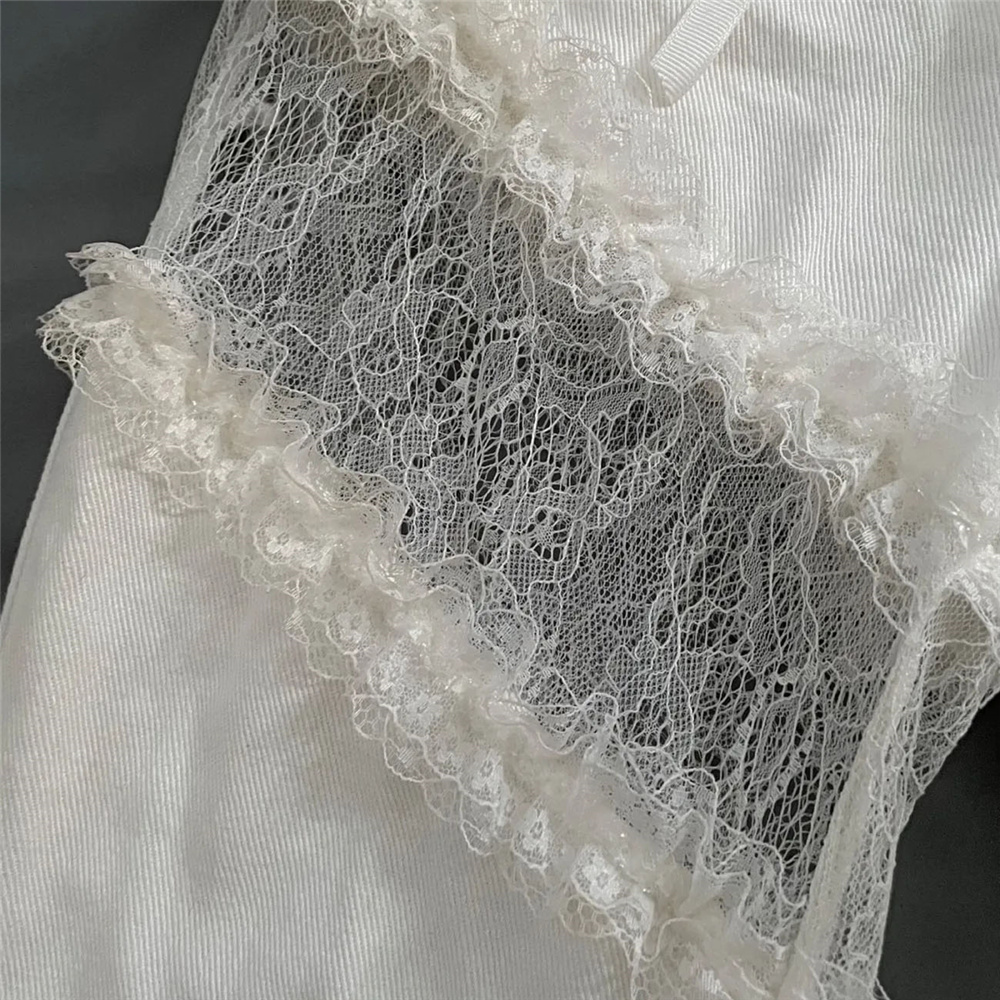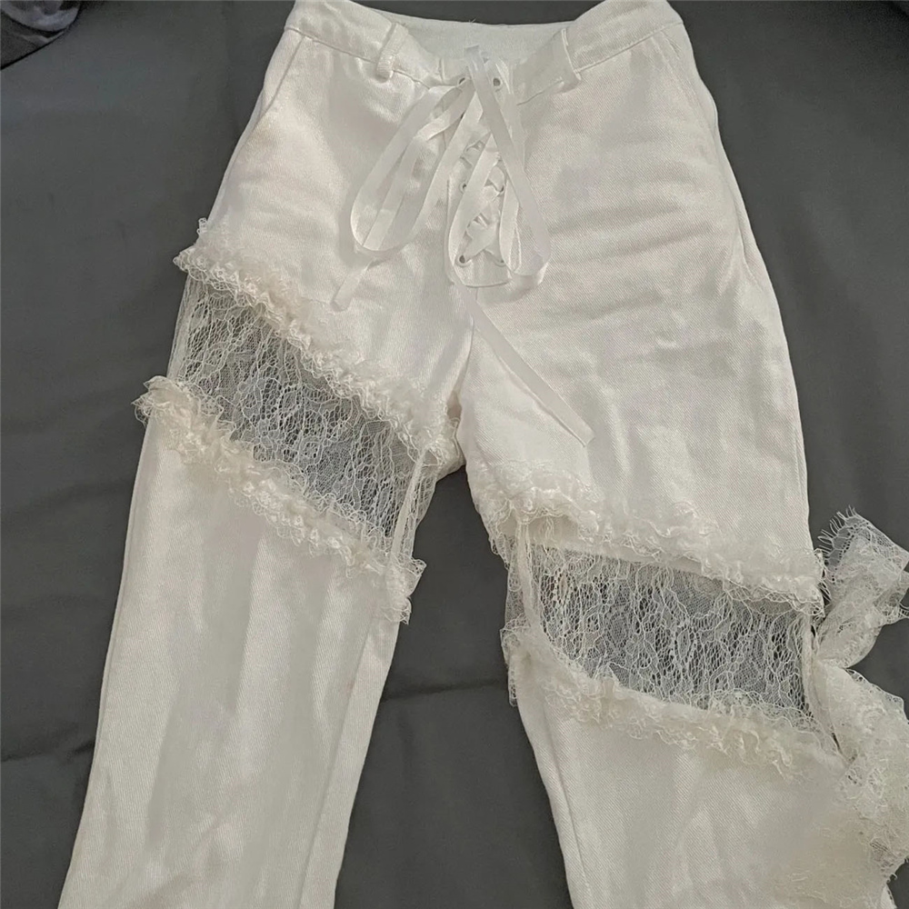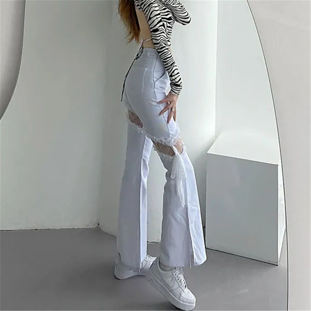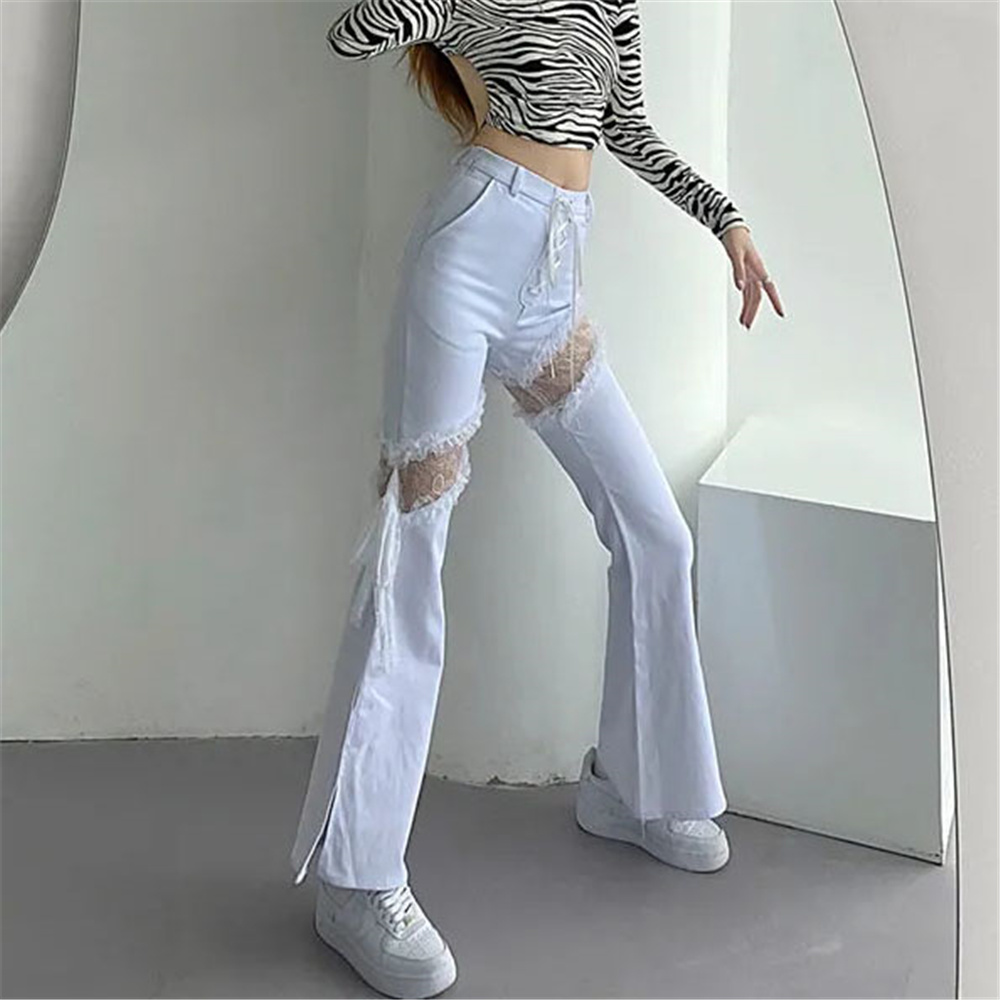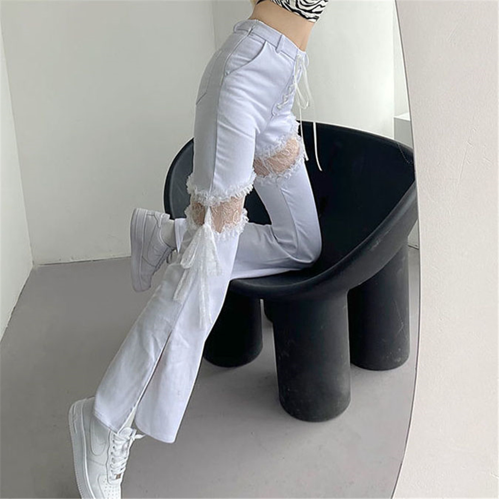 Y2k Lace Stitching Hollow Out Side Slit Bandage High Waist Flared Jeans Slim Gothic Punk Streetwear Denim Pants Harajuku Trouser