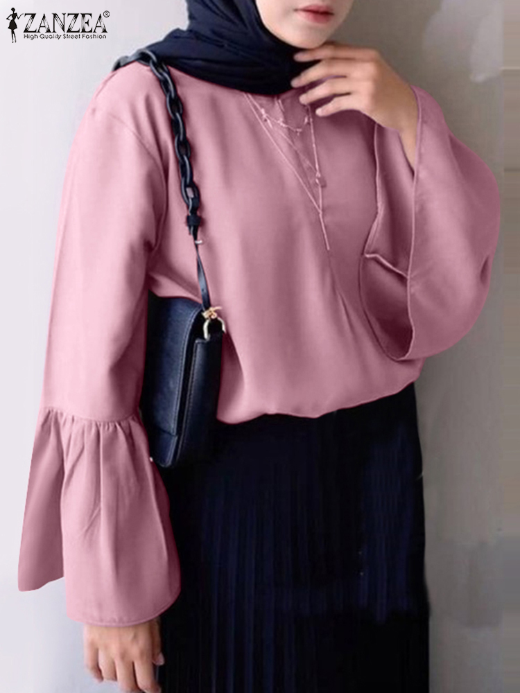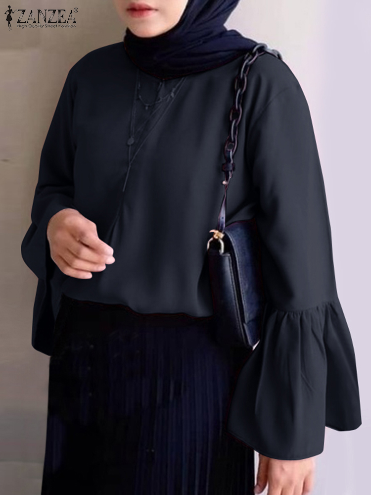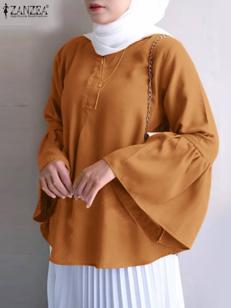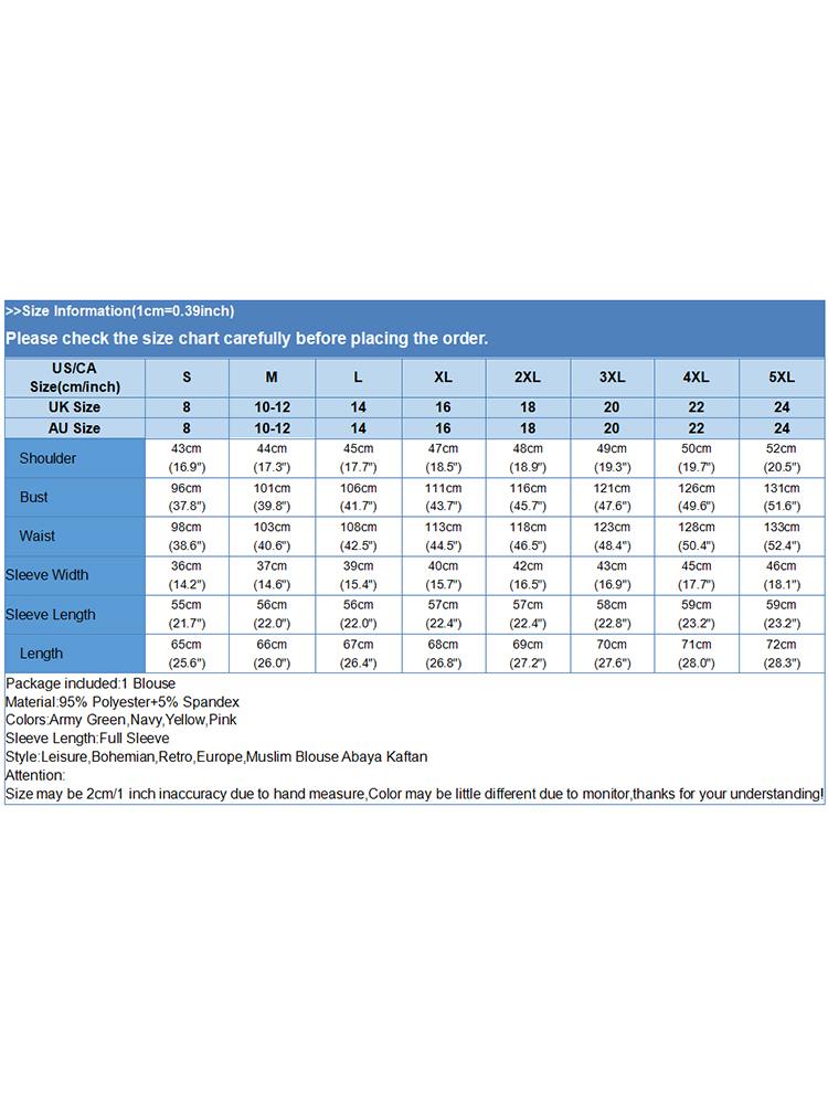 | Package included:1 Blouse Material:95% Polyester+5% Spandex Colors:Army Green,Navy,Yellow,Pink Sleeve Length:Full Sleeve Neckline:O-Neck Pattern:Solid Color Buckle chain:Buttons on the back Thickness:Thin Features:Flare Sleeve Style:Leisure,Bohemian,Retro,Europe,Muslim Blouse Abaya Kaftan Season:Spring,Summer,Autumn,Winter Occasion:Family,Party,Beach,Wedding,Holiday,Employment Label: Yes Attentions: 1.The Real Object May Exist Slightly Colors Differences Compared To Images As Different Computers Display.Caution If Minding,Thanks. 2.There Might Be A Manual Measuring 1-3 cm Error.Sorry For Any Inconvenience. 3.Please Prevail On Real Item, Model Images For Reference Only. 4.Attention!!!Please check the size chart carefully before placing the order.