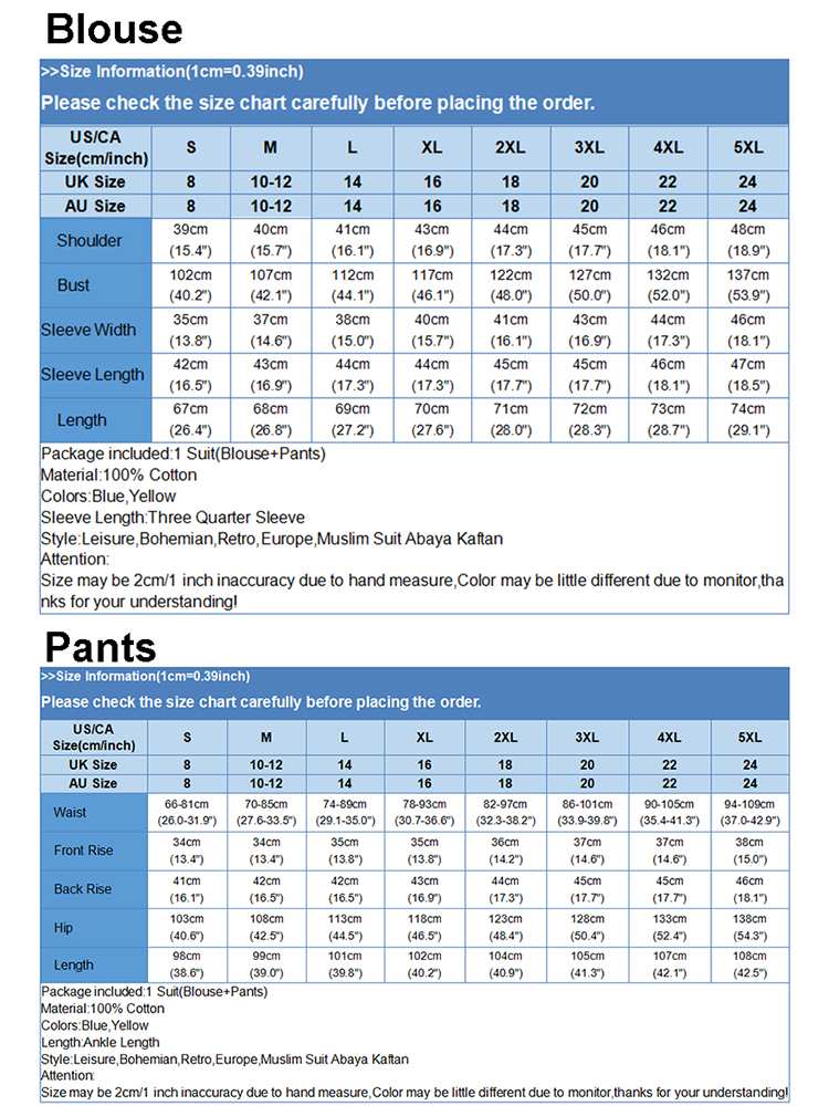 | Package included:1 Suit(Blouse+Pants) Material:100% Cotton Colors:Blue,Yellow Sleeve Length:Three Quarter Sleeve Neckline:O-Neck Pattern:Printing Length:Ankle Length Buckle chain:Button Down Front Waistline:Elastic waist Thickness:Thin Decoration:Side Pockets Style:Leisure,Bohemian,Retro,Europe,Muslim Suit Abaya Kaftan Season:Spring,Summer,Autumn,Winter Occasion:Family,Party,Beach,Wedding,Holiday Attentions: 1.The Real Object May Exist Slightly Colors Differences Compared To Images As Different Computers Display.Caution If Minding,Thanks. 2.There Might Be A Manual Measuring 1-3 cm Error.Sorry For Any Inconvenience. 3.Please Prevail On Real Item, Model Images For Reference Only. 4.Attention!!!Please check the size chart carefully before placing the order. Blouse Pants